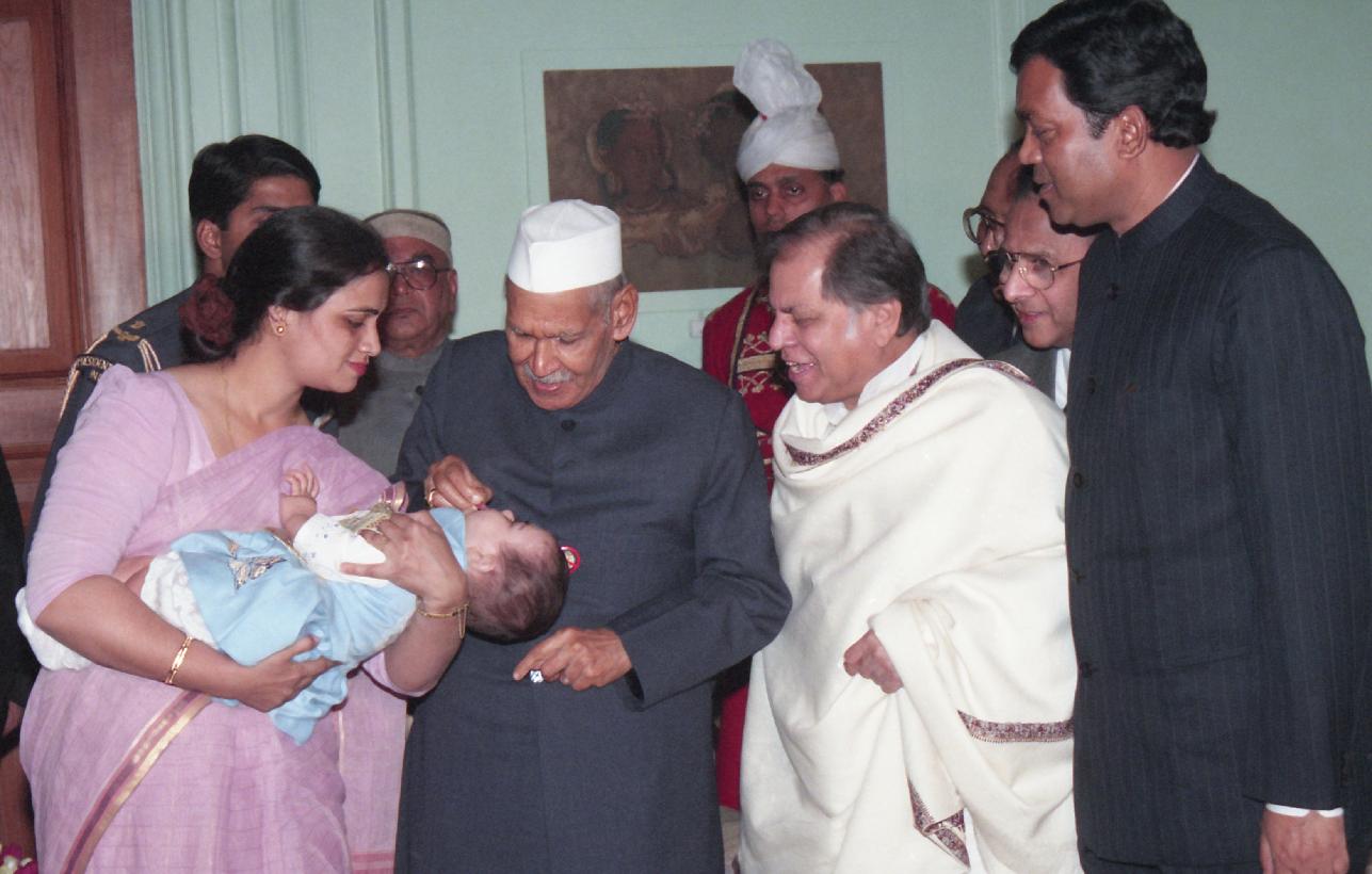 | Caption: | The President of India, Dr. Shankar Dayal Sharma meeting with Shri A.R. Antulay, Minister of Health & Family Welfare alongwith representatives of Rotary International iand launching the social mobilisation programme for Pulse Polio Immunisation by administering polio drops to children, at Rashtrapati Bhavan in New Delhi on November 29, 1995. |