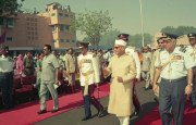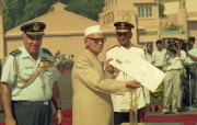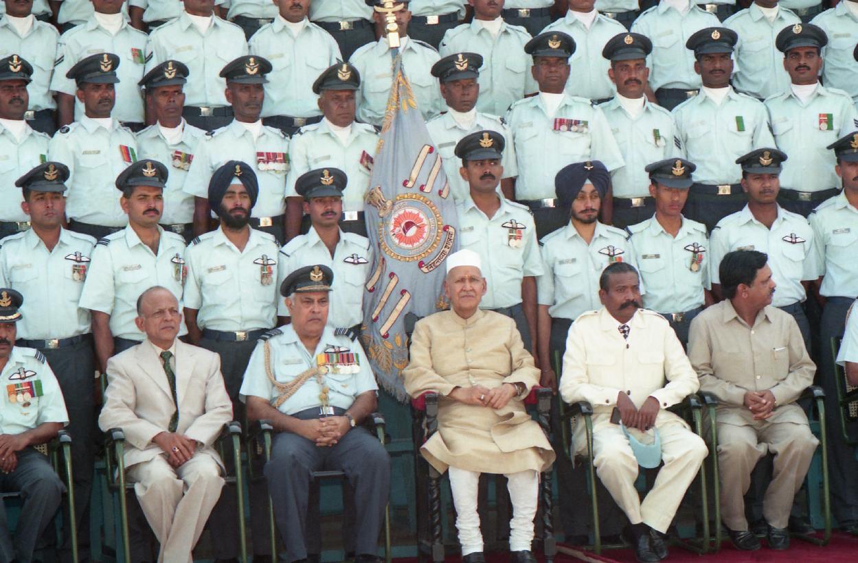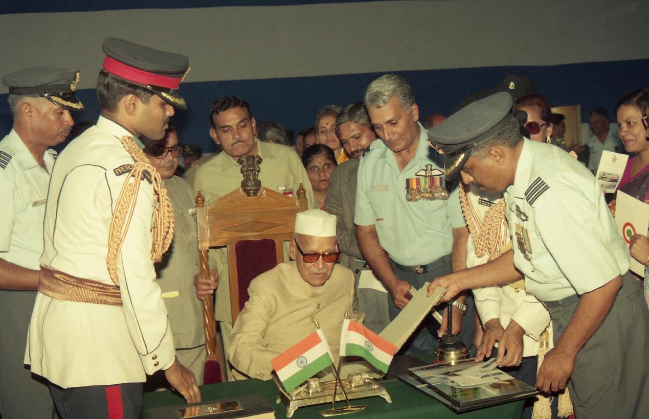 | Caption: | The President of India, Dr. Shankar Dayal Sharma releasing the First Day Cover and inspecting Guard of Honour, at the presentation of Colour and Standard to Flying Instructors School & 15 Squadron, at Jodhpur on October 26, 1995. |