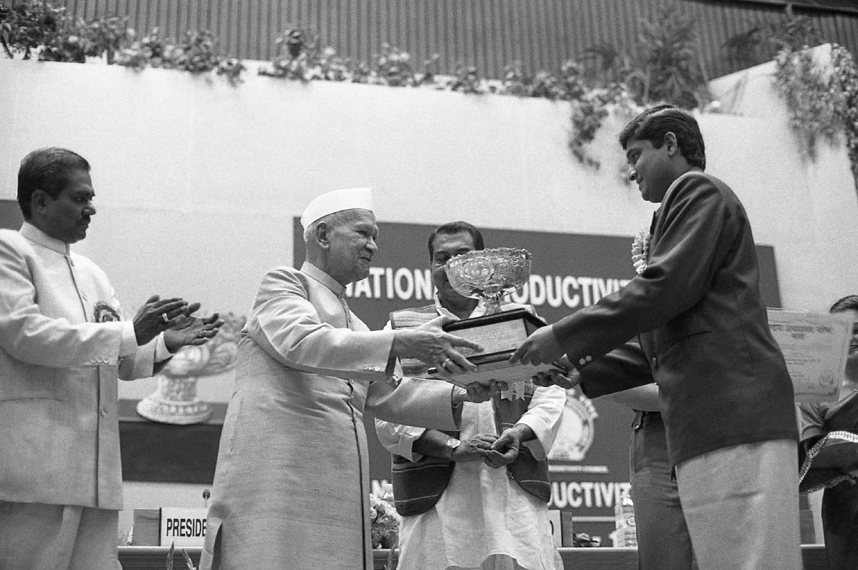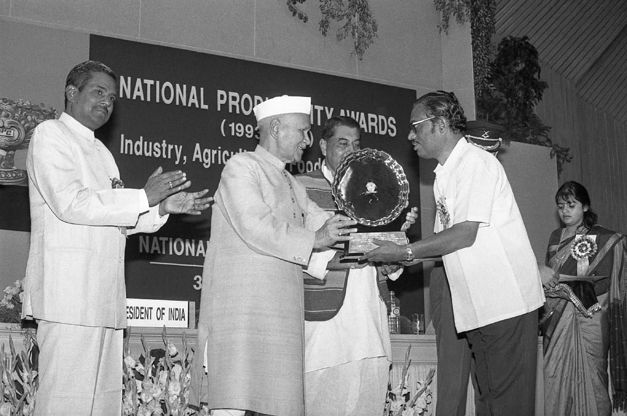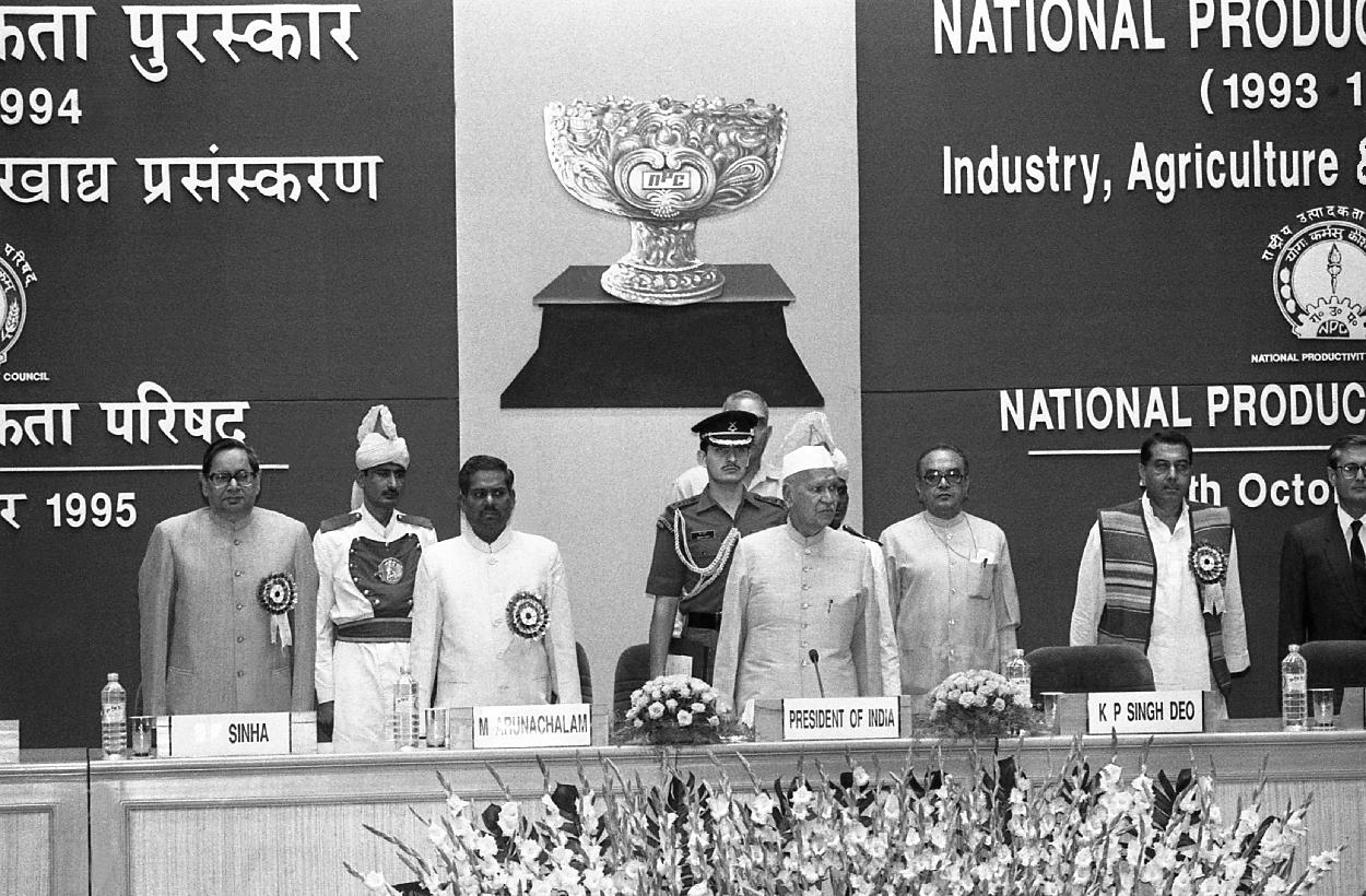 | Caption: | The President of India, Dr. Shankar Dayal Sharma presenting National Productivity Awards of Ministry of Industry at Vigyan Bhavan in New Delhi on October 30, 1995. |