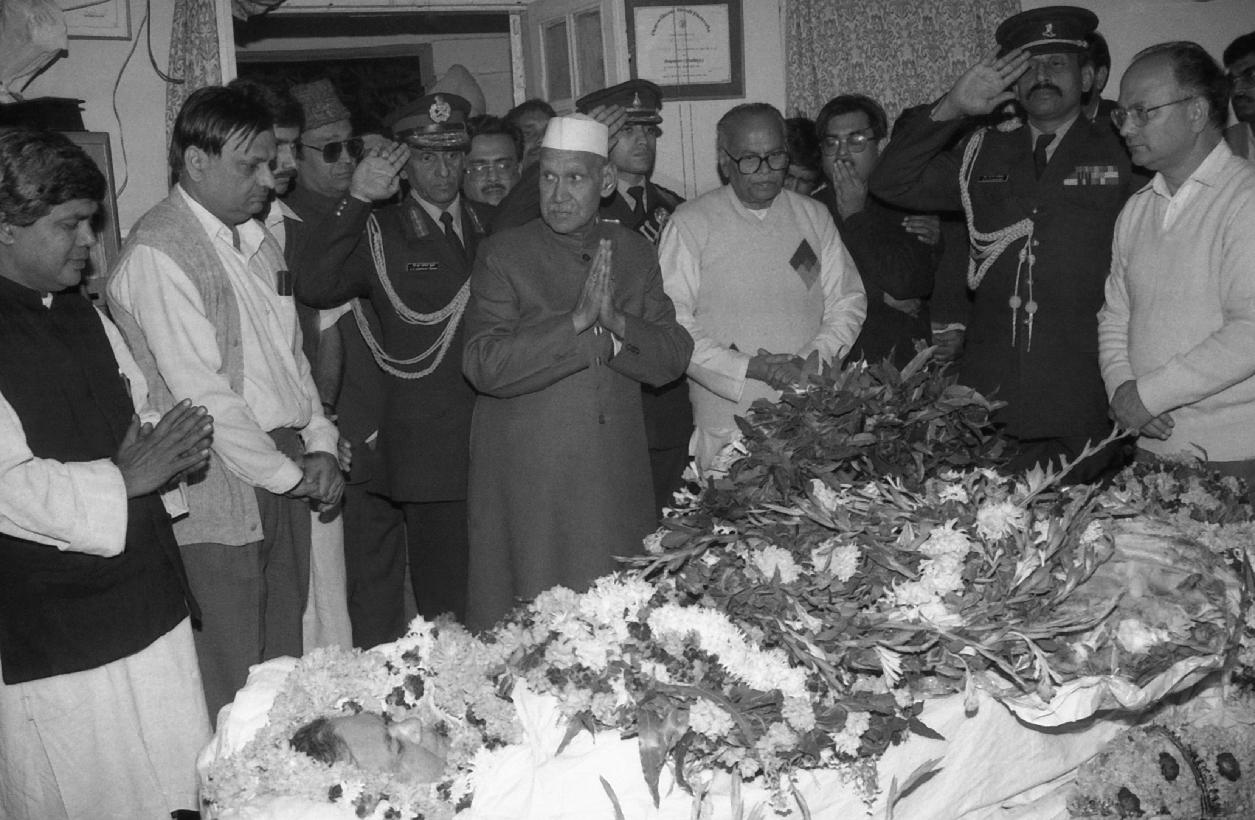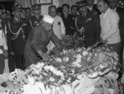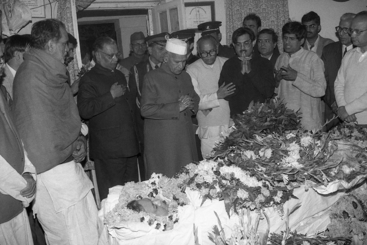 | Caption: | The President of India, Dr. Shankar Dayal Sharma laying wreath at the mortal remains of Shri Shankar Dayal Singh, in New Delhi on November 26, 1995. |