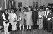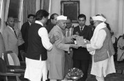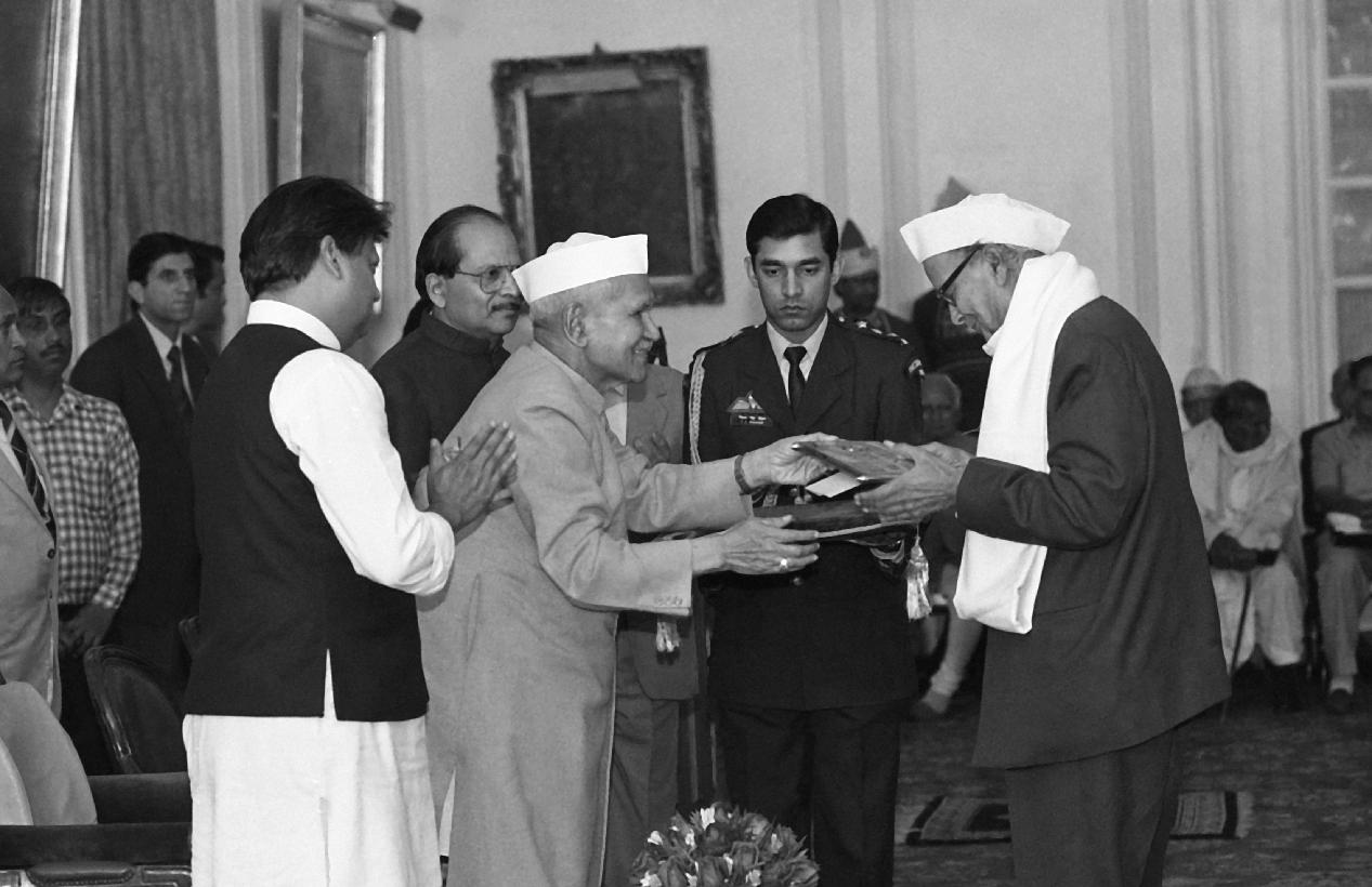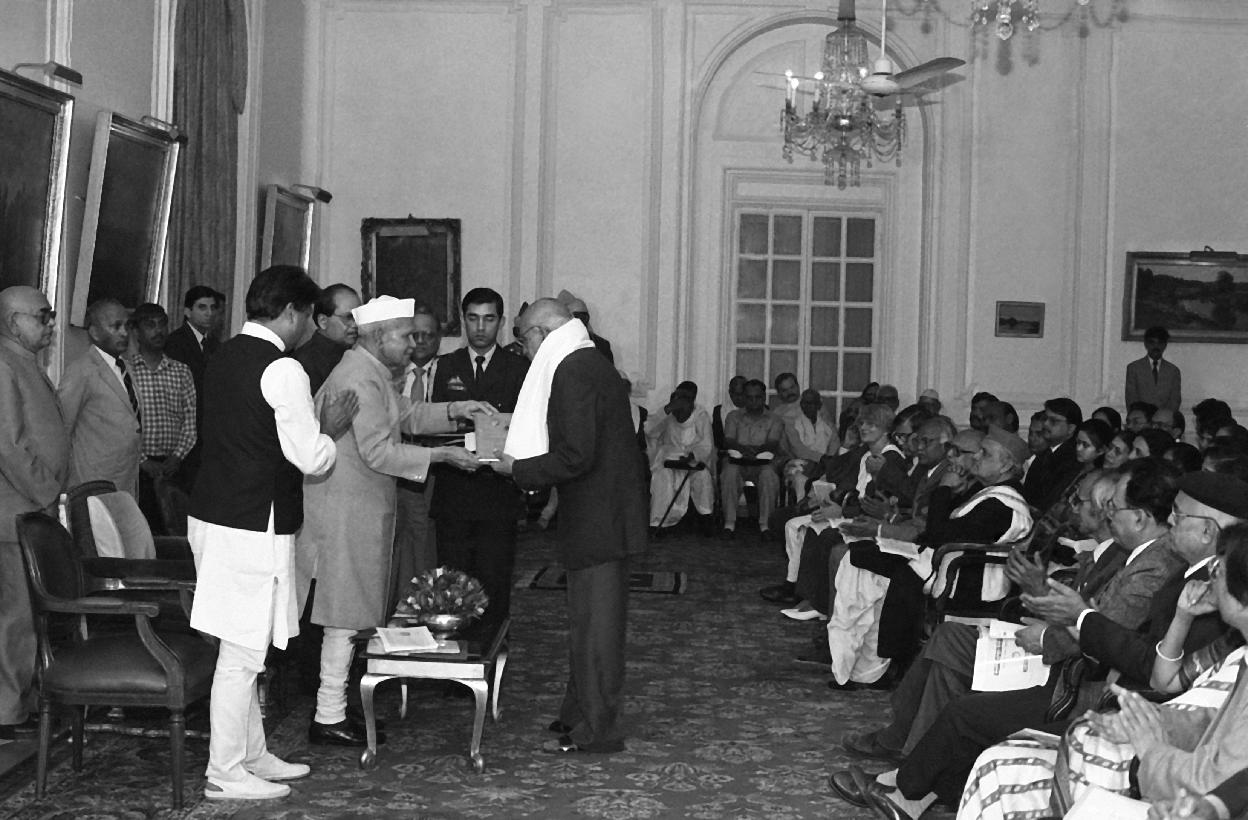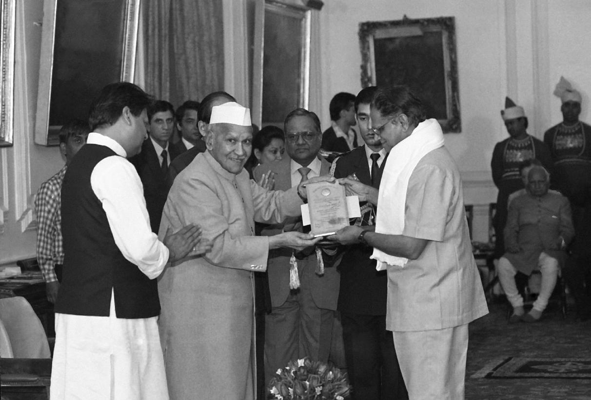 | Caption: | The President of India, Dr. Shankar Dayal Sharma presenting awards to Hindi Scholars, sponsored by the Kendriya Hindi Sansthan, Agra, at Rashtrapati Bhavan in New Delhi on November 27, 1995. |