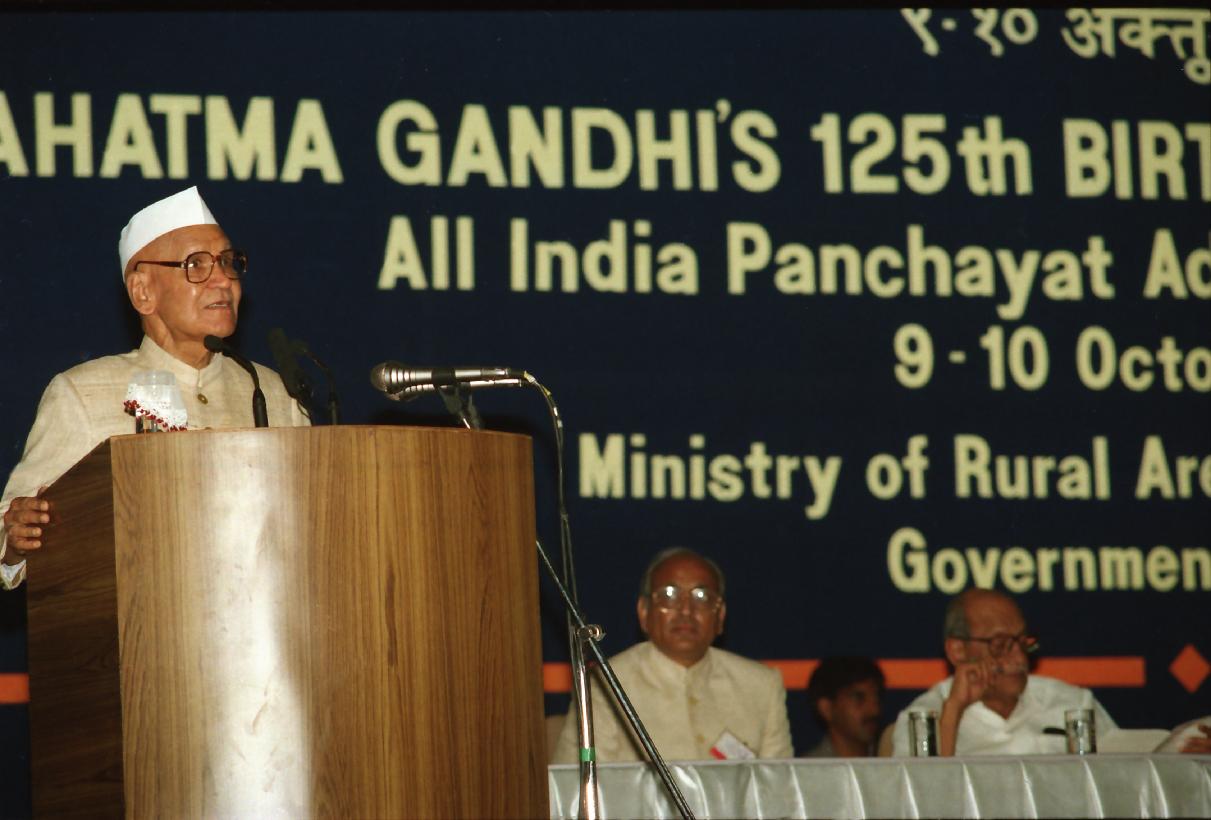 | Caption: | The President of India, Dr. Shankar Dayal Sharma addressing the Sammelan of Panchayat Adhyakshas, organised by the Ministry of Rural Areas & Employment at Indira Gandhi Indoor Stadium in New Delhi on October 10, 1995. |