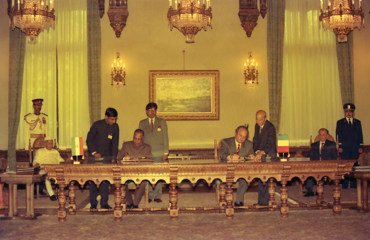 | Caption: | The President of India, Dr. Shankar Dayal Sharma and the President, Romania, Mr. Ion Iliescu,witnessing the signing of Agreements, at Bucharest, in Romania on June 02, 1994. |