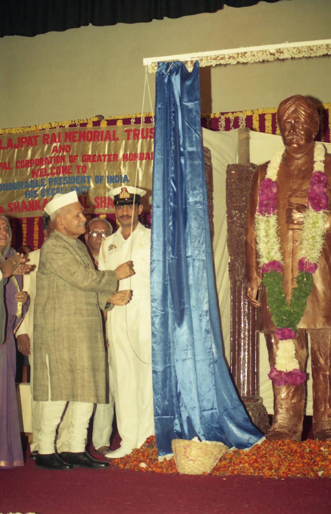 | Caption: | The President of India, Dr. Shankar Dayal Sharma unveiling the Statue of Lala Lajpat Rai and naming of the Municipal Garden, at Amar Gian Grover Auditorium, Mumbai on January 08, 1996. |