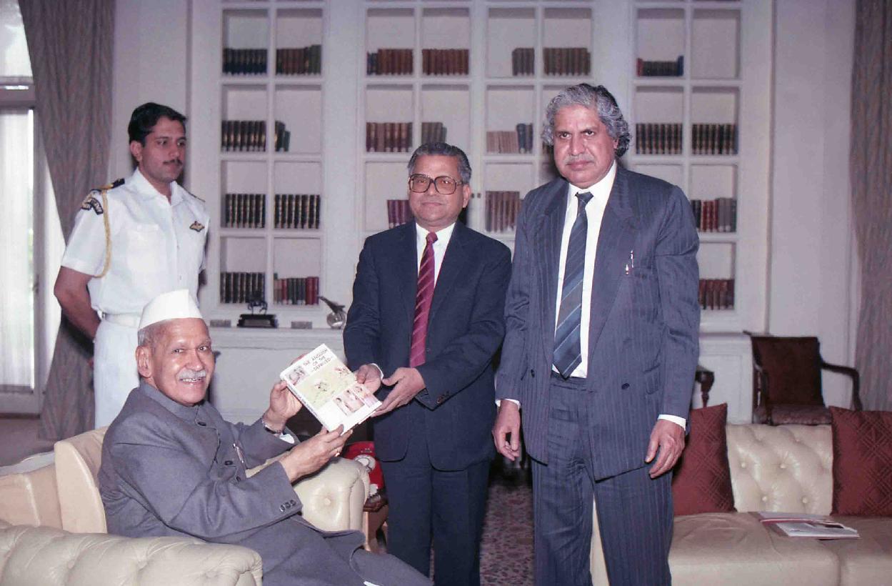 | Caption: | The President of India, Dr. Shankar Dayal Sharma receiving a copy of the book of Shri L. Mishra at Rashtrapati Bhavan in New Delhi on March 11, 1994. |