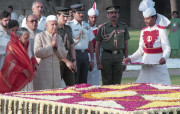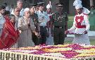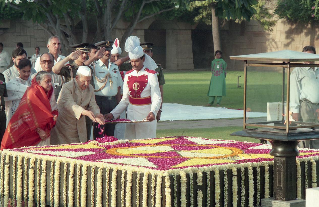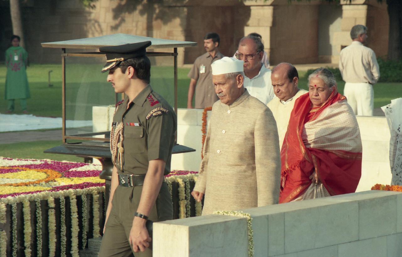 | Caption: | The President of India, Dr. Shankar Dayal Sharma paying floral tributes at the Samadhi of Mahatma Gandhi on his Birth Anniversary at Rajghat in Delhi on October 02, 1995. |