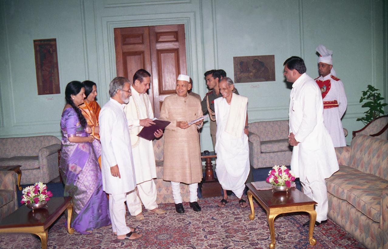 | Caption: | The President of India, Dr. Shankar Dayal Sharma meeting with Shri Vasant Sathe with others at Rashtrapati Bhavan in New Delhi on October 12, 1995. |