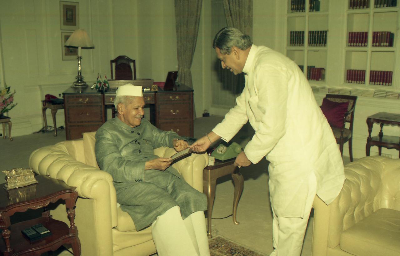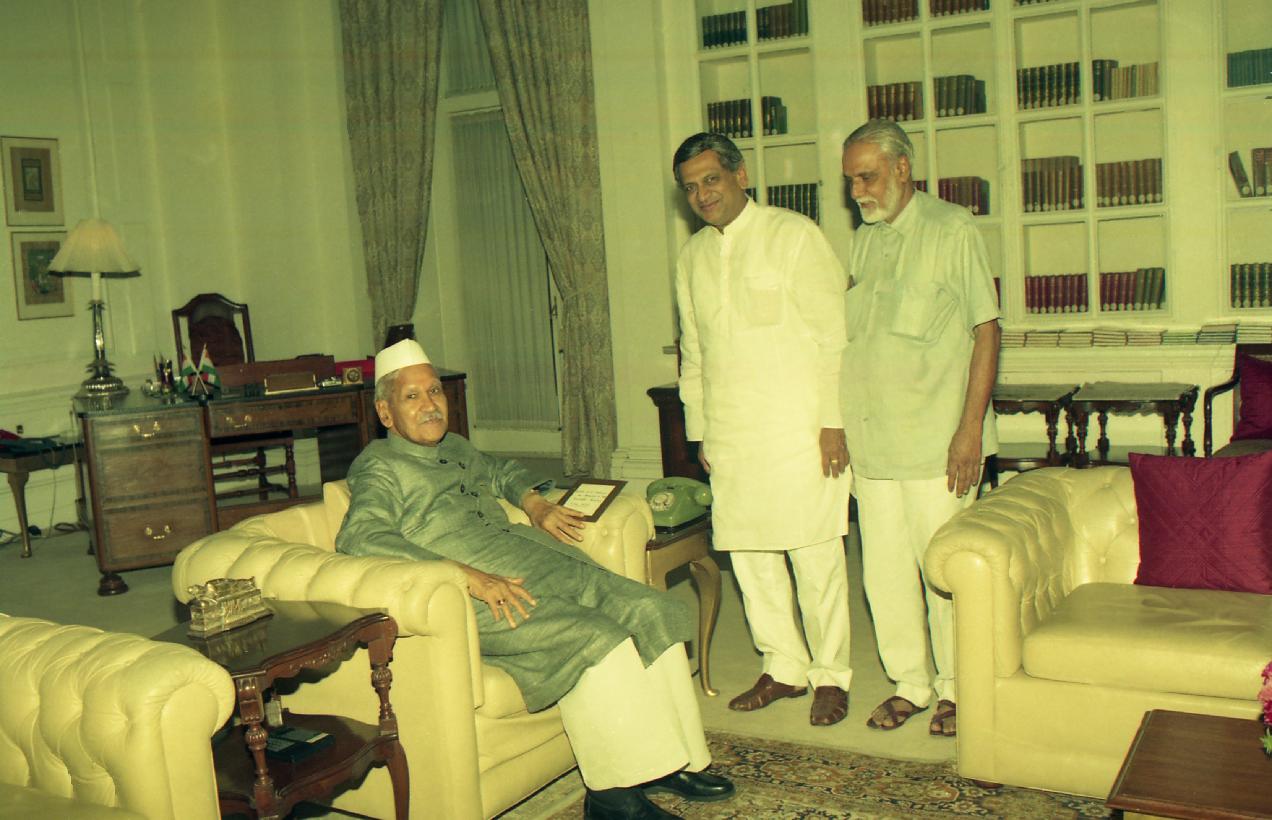 | Caption: | The President of India, Shri Shankar Dayal Sharma meeting with Shri Satchidananda, MP(RS) and Shri S.M. Krishna, MP-Elect at Rashtrapati Bhavan in New Delhi on May 14, 1996. |