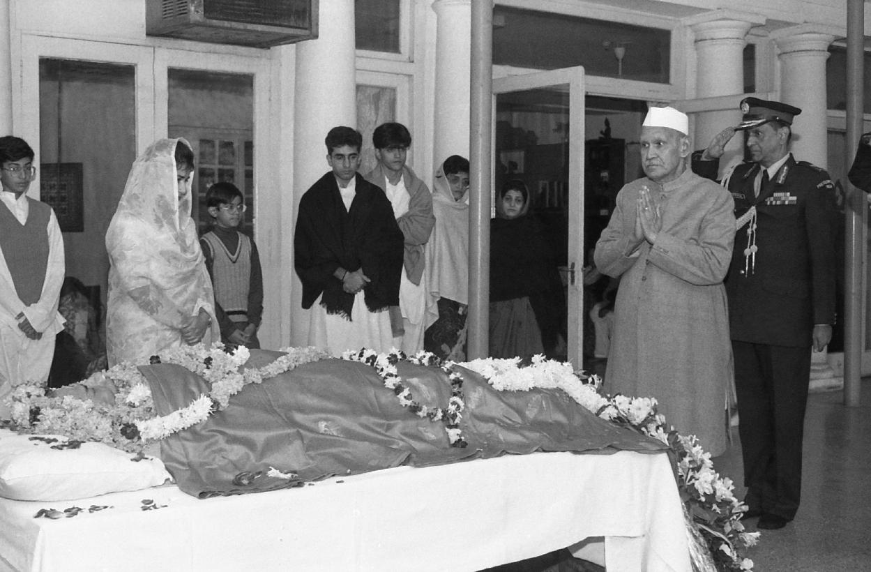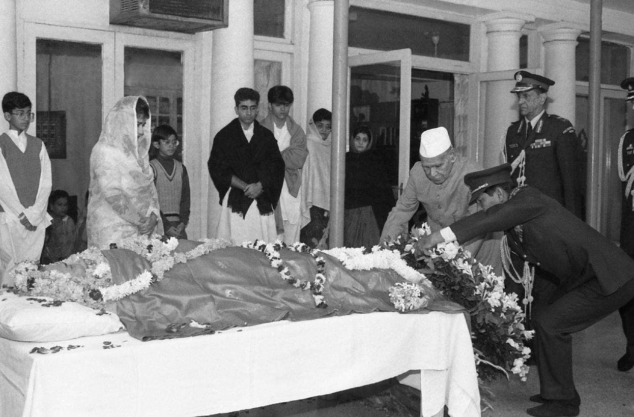 | Caption: | The President of India, Dr. Shankar Dayal Sharma laying wreath at the mortal remains of Shri Dinesh Singh, in New Delhi on November 30, 1995. |