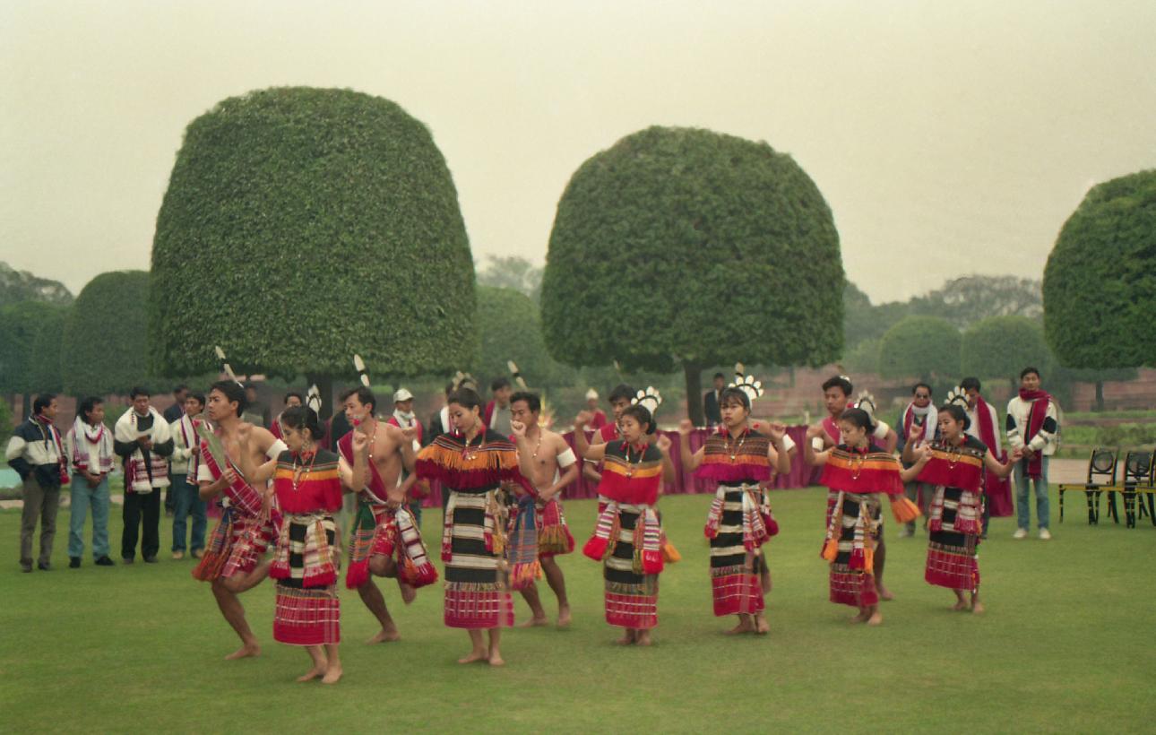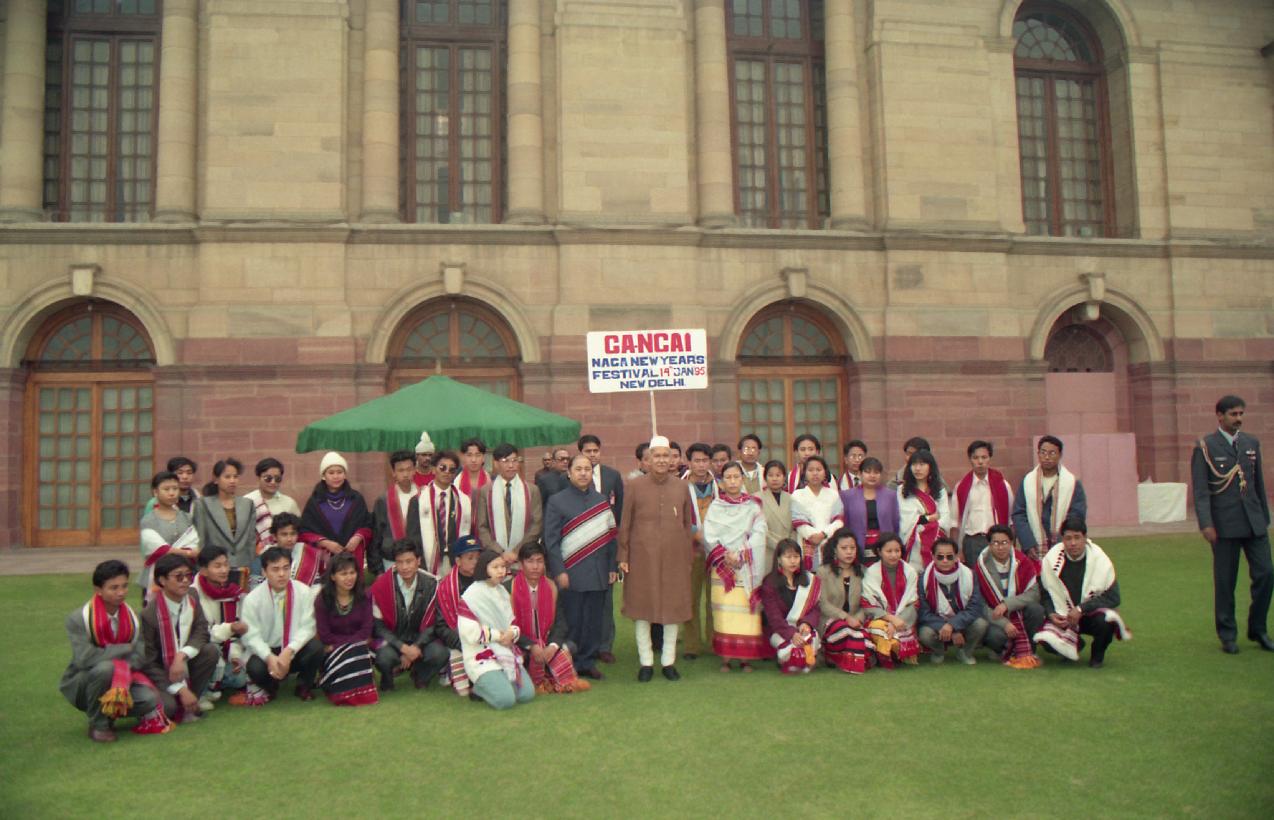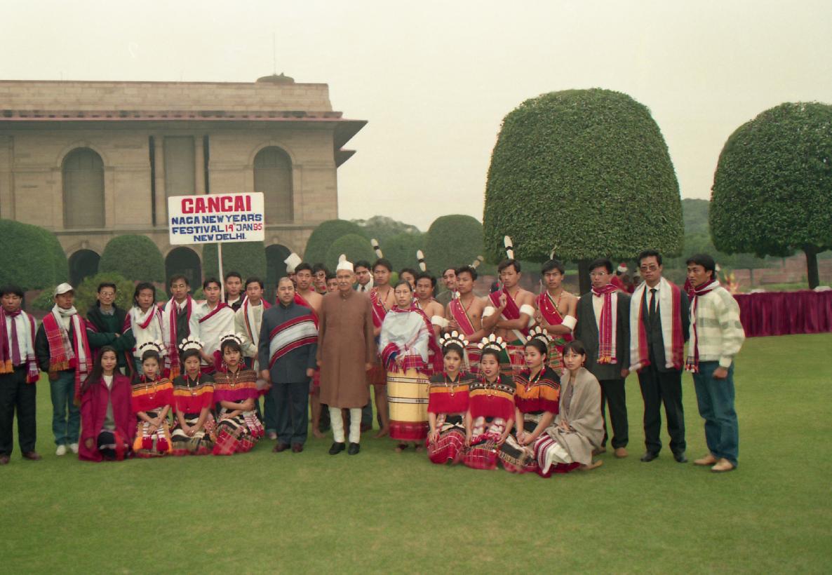| Caption: | The President of India, Dr. Shankar Dayal Sharma meeting with a group of Naga students led by Prof. M. Kamson, MP (LS) on the occasion of 'Ga-Nagi' (Naga Festival-New Year) at Rashtrapati Bhavan in New Delhi on January 14, 1995. |