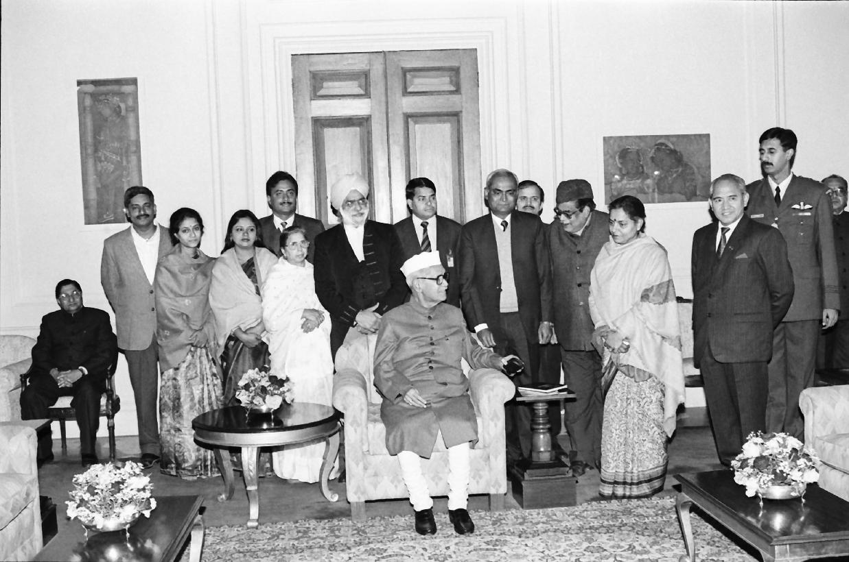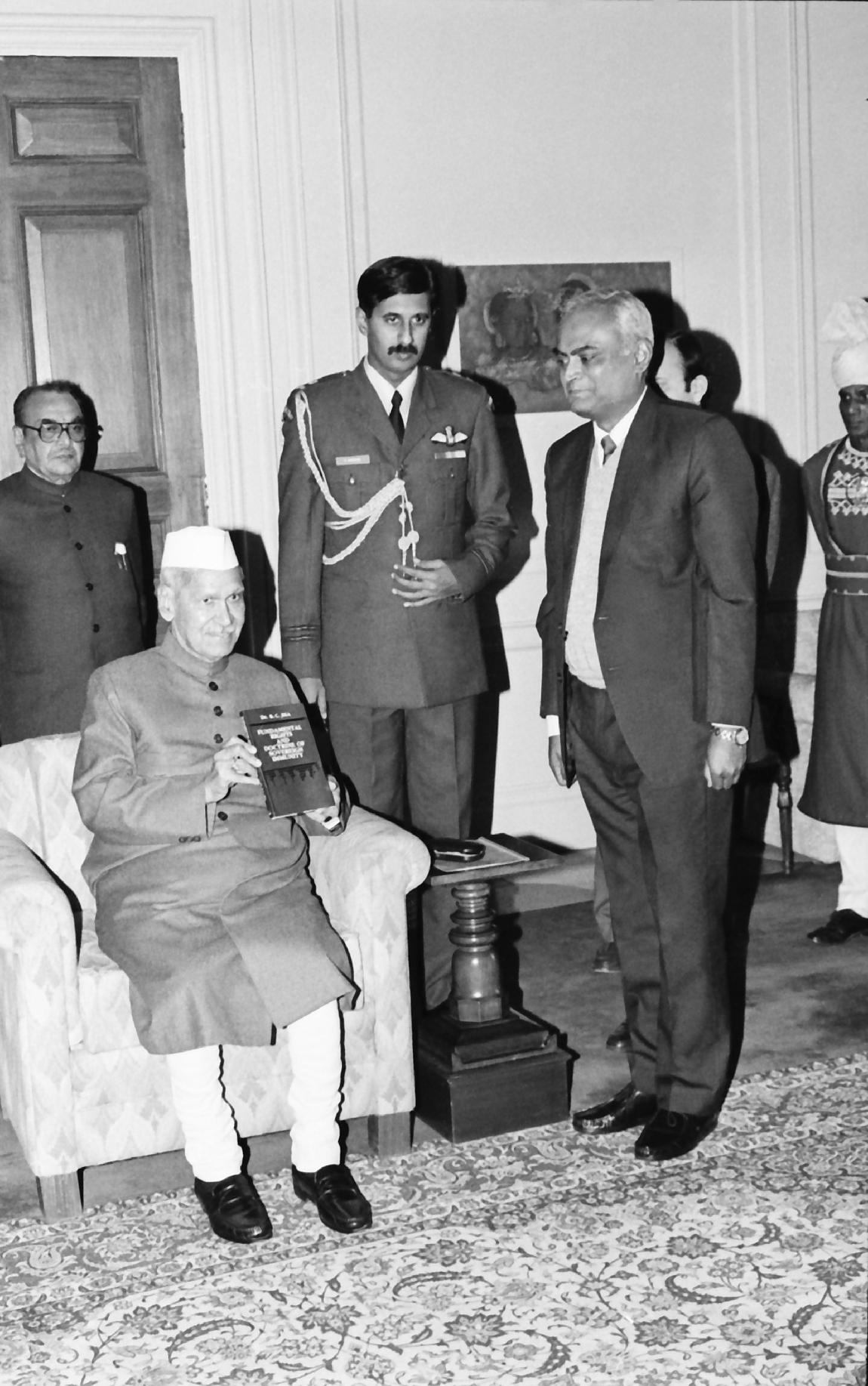 | Caption: | The President of India, Dr. Shankar Dayal Sharma receiving a copy of the book "Fundamental Rights and Doctrine of Sovereign Immunity" of Dr. R.C. Jha, IPS at Rashtrapati Bhavan in New Delhi on January 17, 1995. |