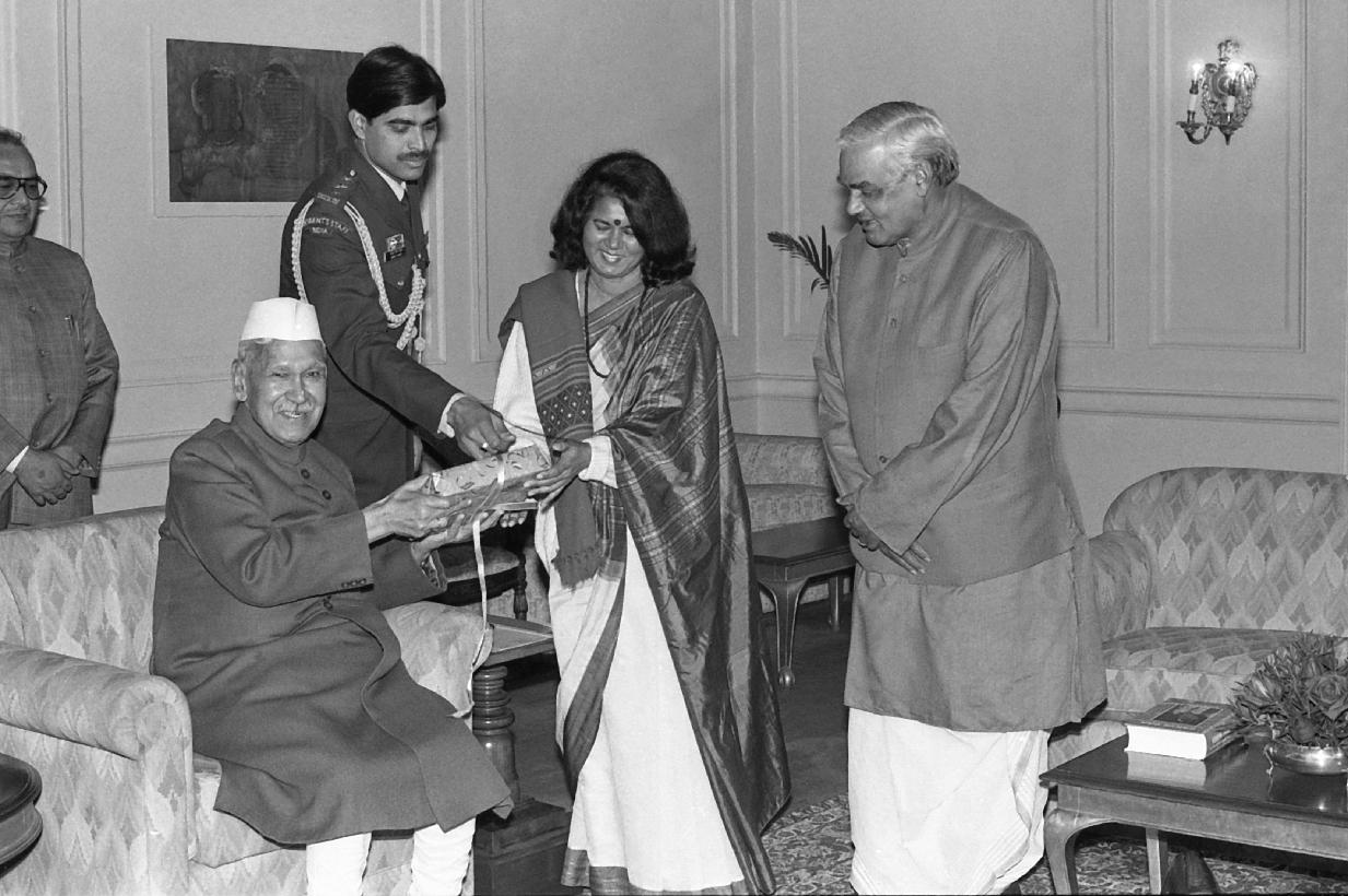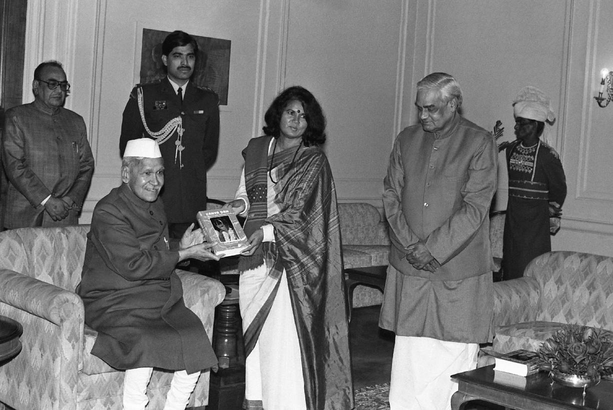 | Caption: | The President of India, Dr. Shankar Dayal Sharma receiving a copy of the book "Kanyadaan" of Smt. Sarita Boodhoo of Mauritius at Rashtrapati Bhavan in New Delhi on January 19, 1995. |