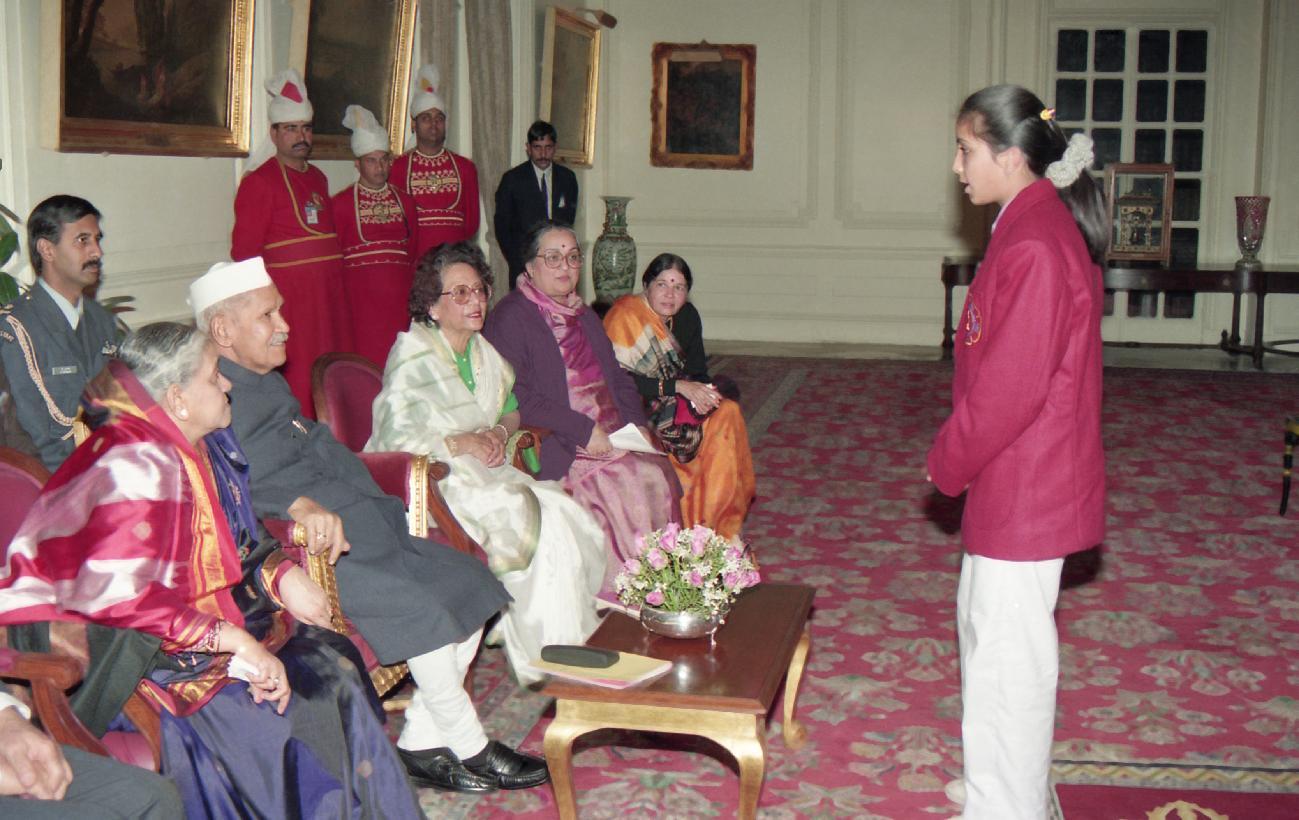 | Caption: | The President of India, Dr. Shankar Dayal Sharma meeting with National Bravery Awards winning Children at Rashtrapati Bhavan in New Delhi on January 21, 1995. |