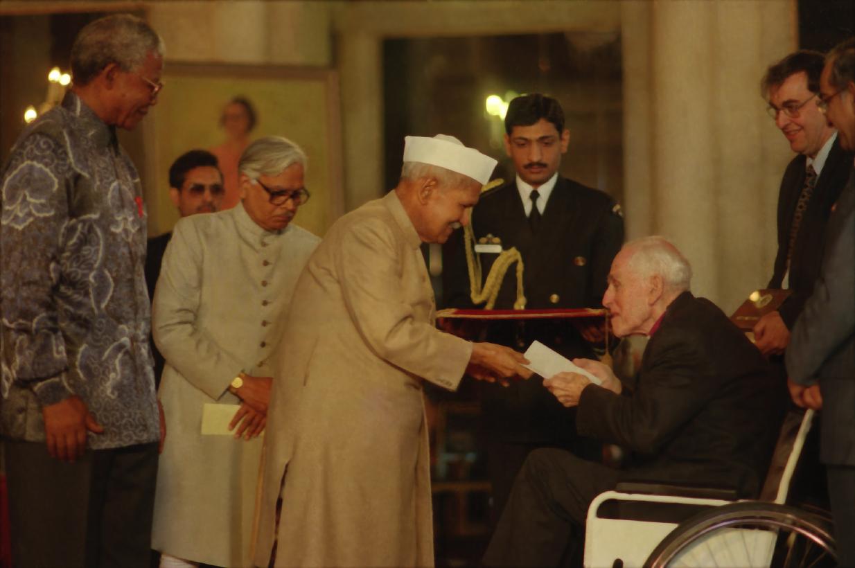 | Caption: | The President of India, Dr. Shankar Dayal Sharma presenting the Indira Gandhi Peace Prize-1994 to Archbishop Trevor Huddleston of South Africa at Rashtrapati Bhavan in New Delhi on January 27, 1995. |