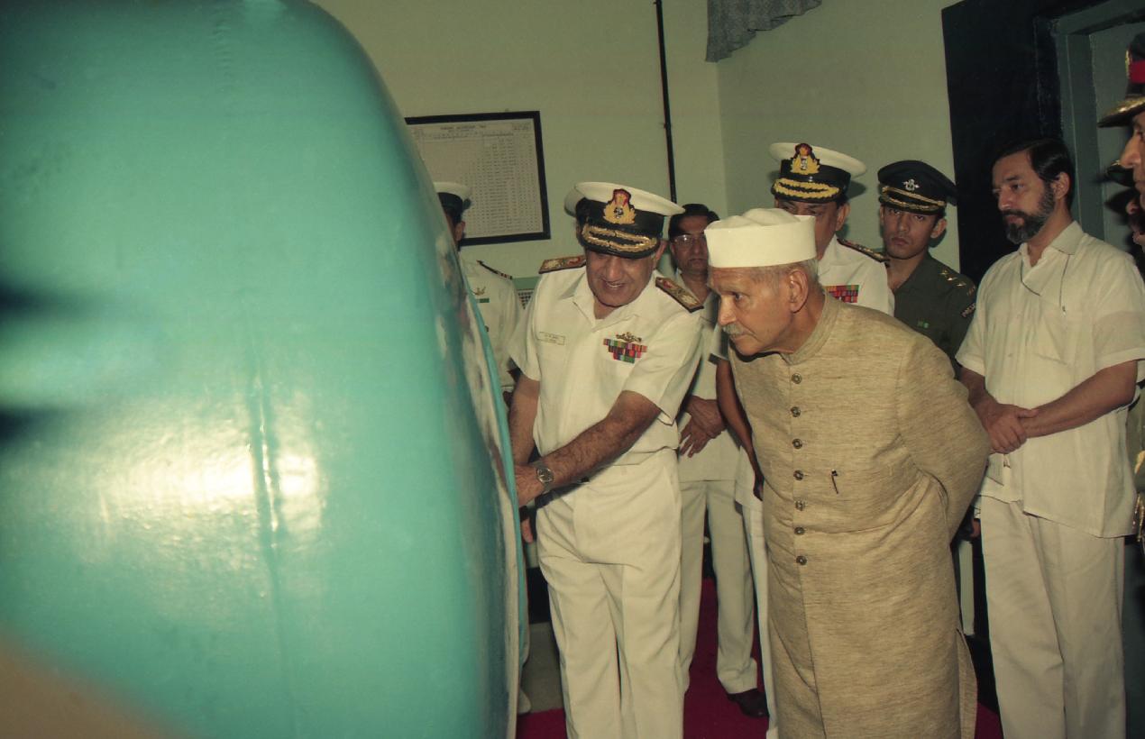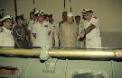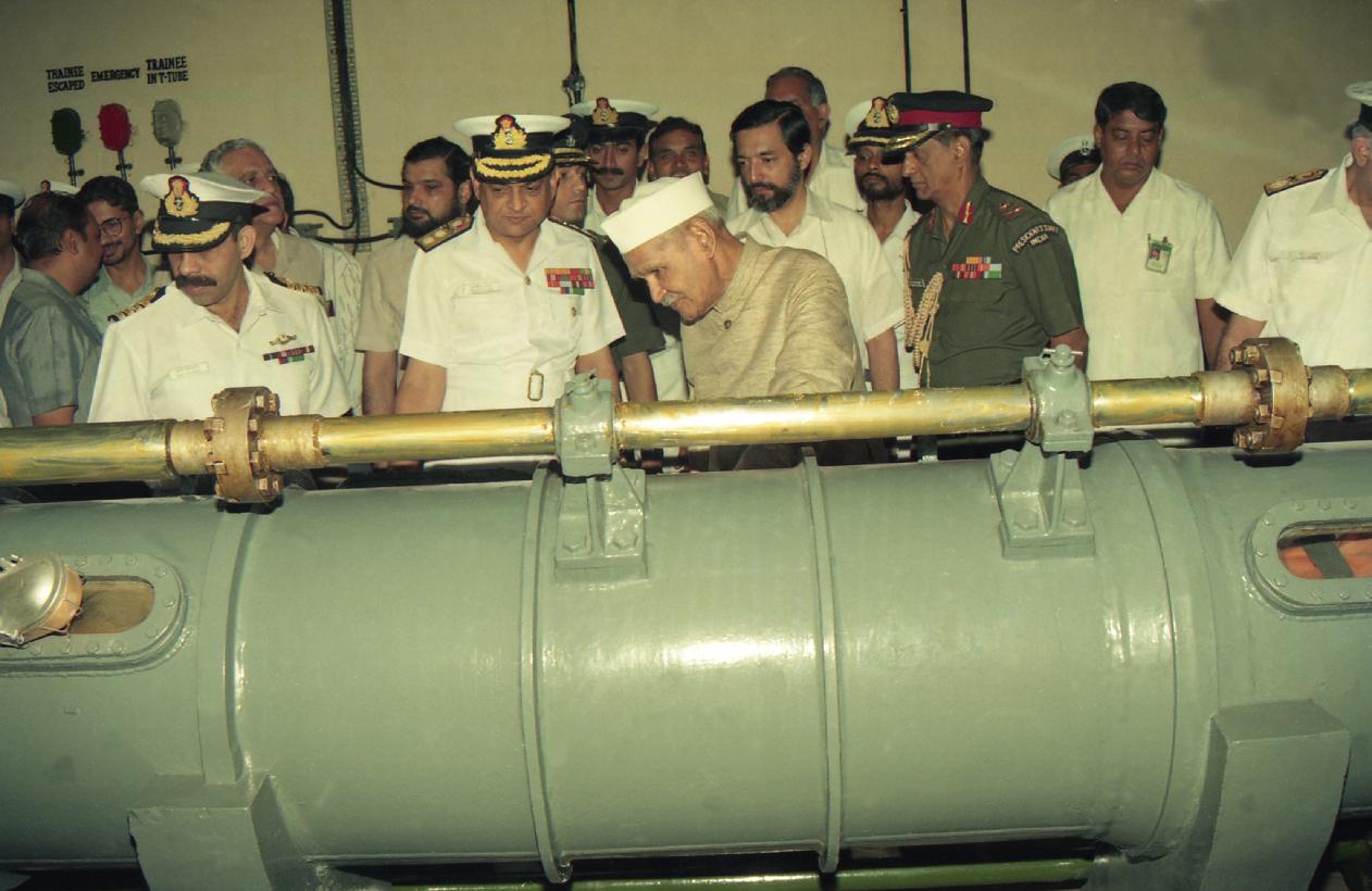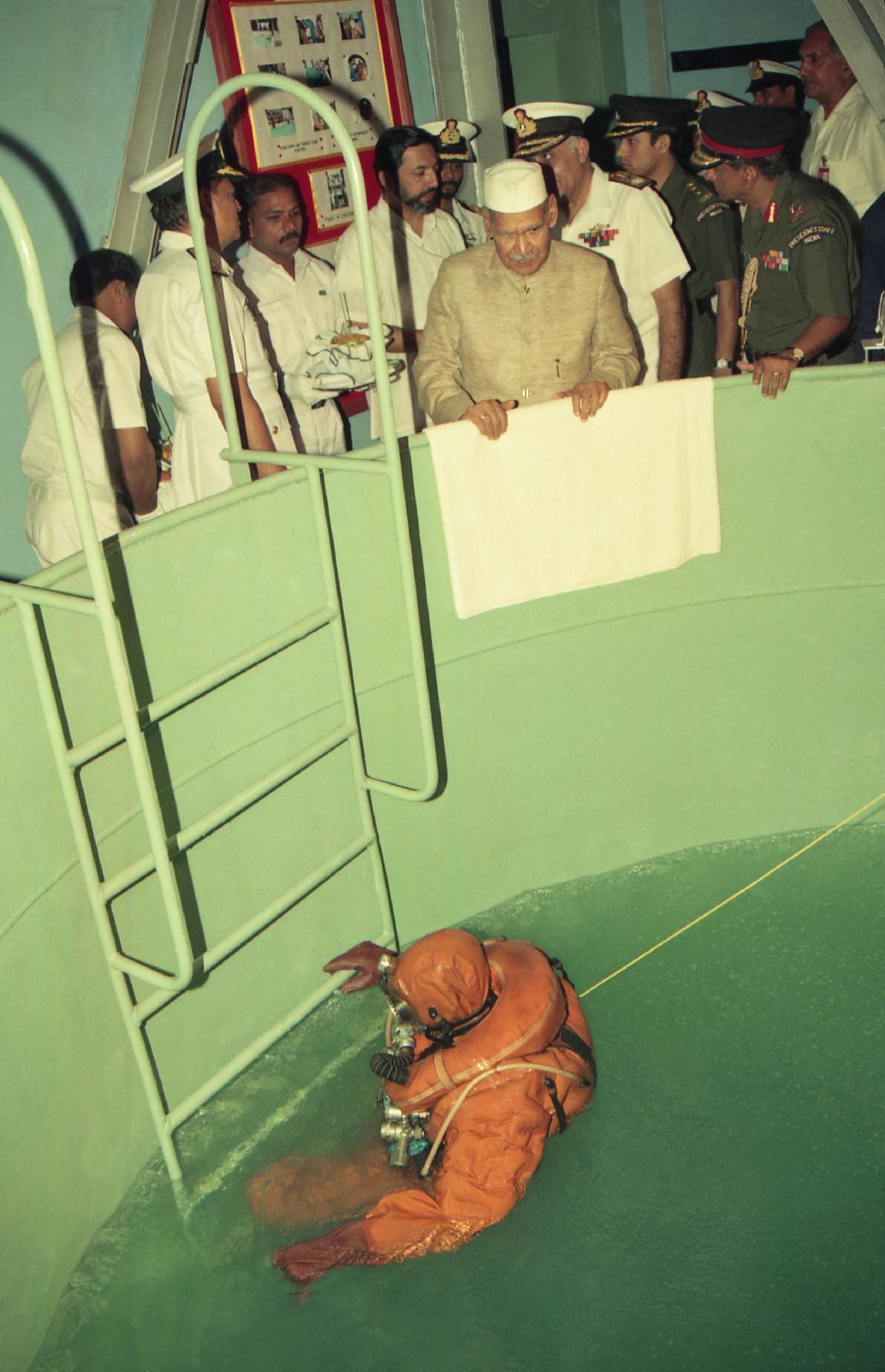 | Caption: | The President of India, Dr. Shankar Dayal Sharma witnessing Submarine Escape Demonstration, at Visakhapatnam, Andhra Pradesh on October 07, 1995. |