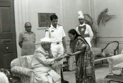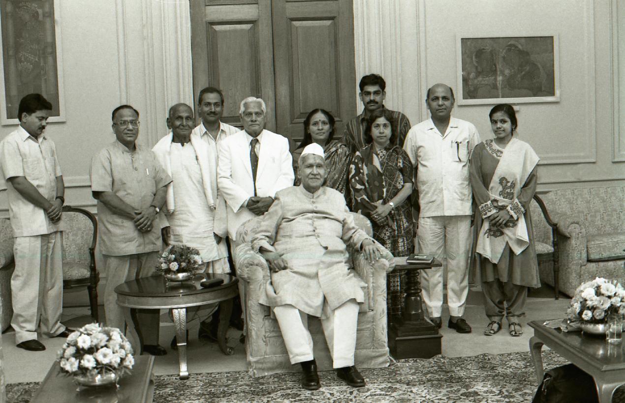 | Caption: | The President of India, Dr. Shankar Dayal Sharma receiving a copy of the book "Shri Subhash Charitam" from Dr. Sushma Kulshreshtha and Pt. Trigunanand Shukla at Rashtrapati Bhavan in New Delhi on April 11, 1996. |