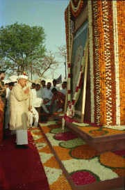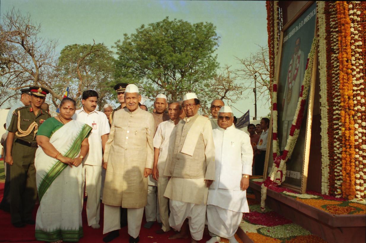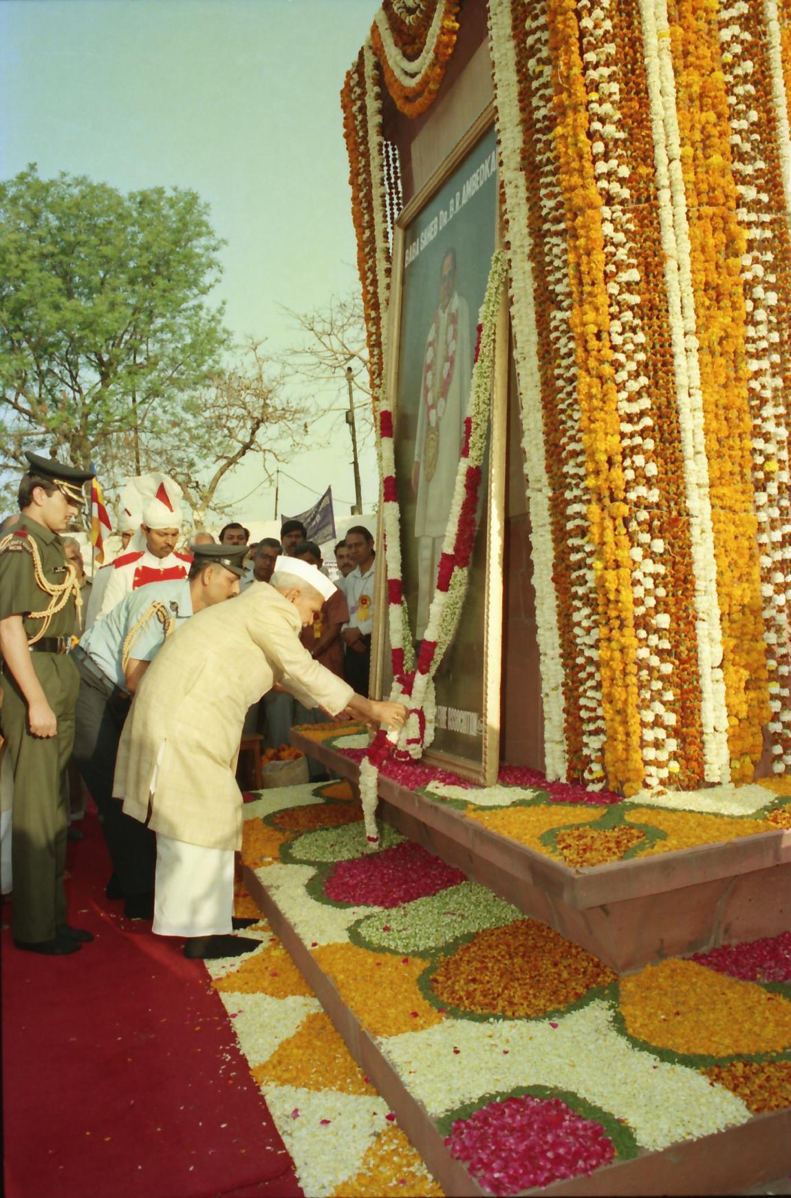 | Caption: | The President of India, Dr. Shankar Dayal Sharma garlanding at the statue of Baba Saheb Dr. B.R. Ambedkar on the occasion of his 105th Birth Anniversary at Parliament House in New Delhi on April 14, 1996. |