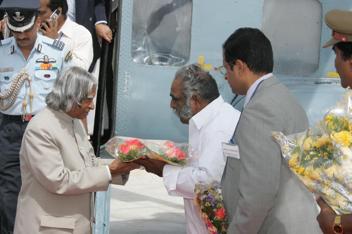 | Caption: | The President of India, Dr A P J Abdul Kalam being welcomed at Narayani Peetam at Vellore Helipad in Tamil Nadu on Dec 01, 2005 |