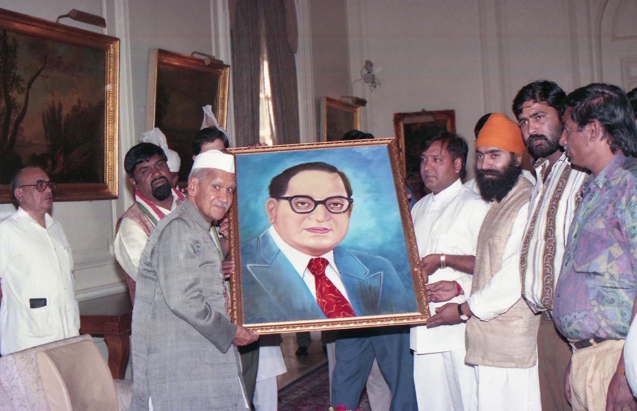 | Caption: | The President of India, Dr. Shankar Dayal Sharma being presented a portrait of Dr. B.R. Ambedkar by All India Safai Mazdoor Sangh on the occasion of Dr. Ambedkar's Birthday, at Rashtrapati Bhavan in New Delhi on April 14, 1996. |