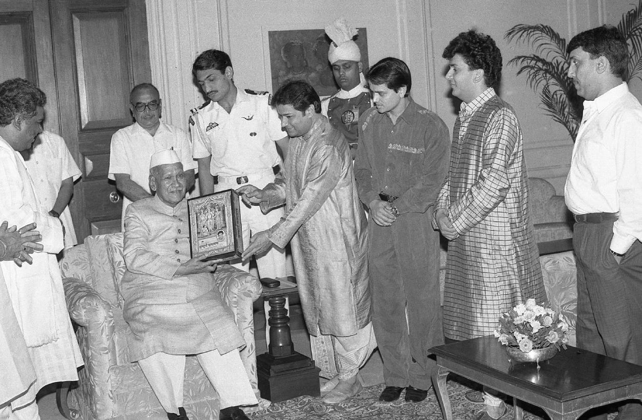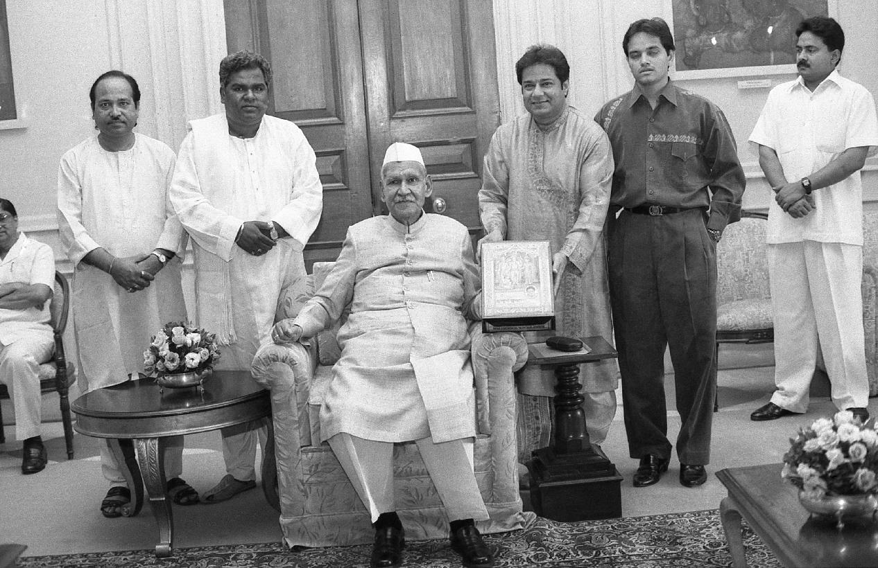| Caption: | The President of India, Dr. Shankar Dayal Sharma receiving a set of cassettes of Sant Tulsidas "Sampooran Ramayan" from Shri Ganesh Jain of Venus Records & Tapes at Rashtrapati Bhavan in New Delhi on April 15, 1996. |