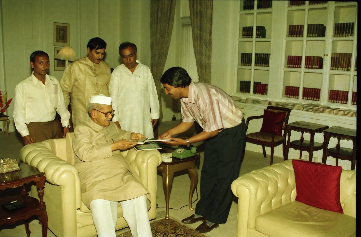 | Caption: | The President of India, Dr. Shankar Dayal Sharma receiving a copy of the book "Dard Ki Lakeeren" from Shri Asif Barelvi with others at Rashtrapati Bhavan in New Delhi on April 16, 1996. |