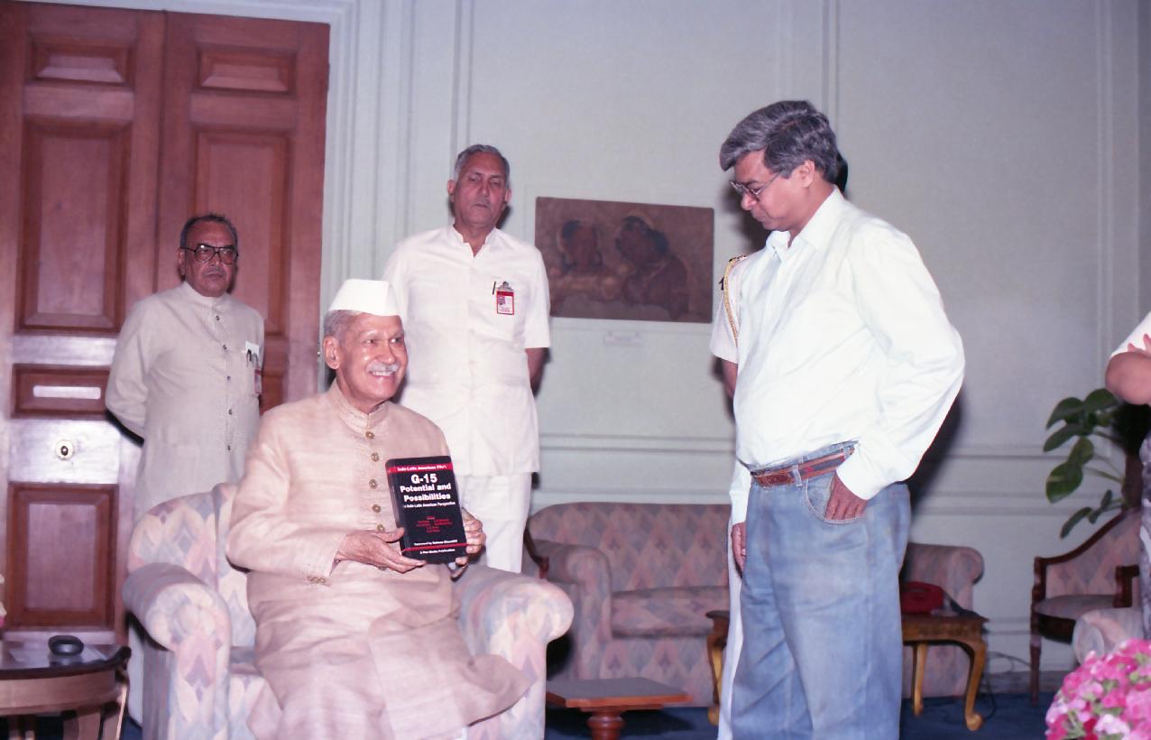 | Caption: | The President of India, Dr. Shankar Dayal Sharma receiving a copy of the book on G-15 from Shri Om Gupta at Rashtrapati Bhavan in New Delhi on March 28, 1994. |