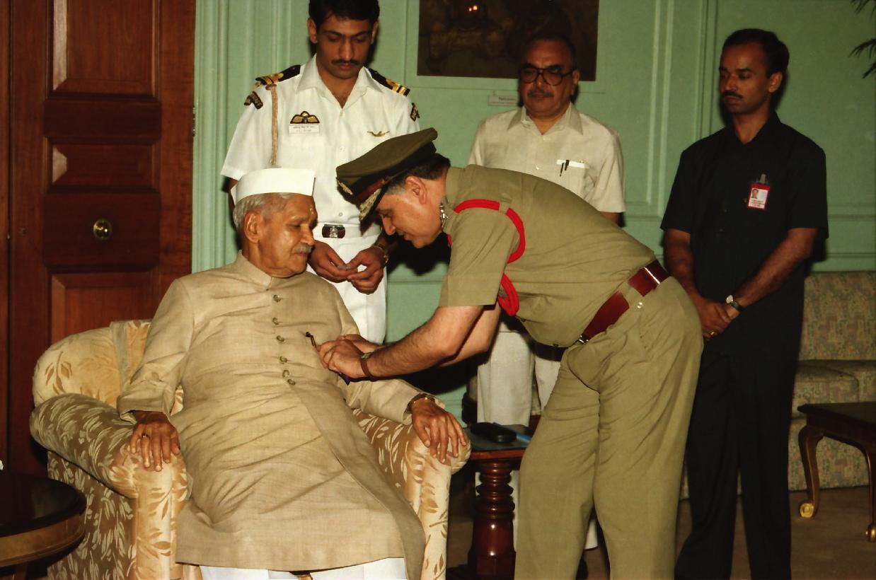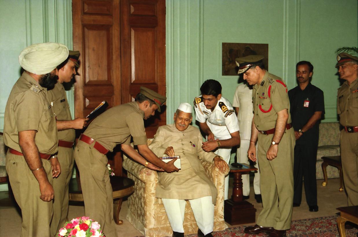 | Caption: | The President of India, Dr. Shankar Dayal Sharma being pinned a flag on the occasion of Fire Service Week by Shri S.D. Dheri, Chief Fire Officer with other officers from the Delhi Fire Service, at Rashtrapati Bhavan in New Delhi on April 20, 1996. |