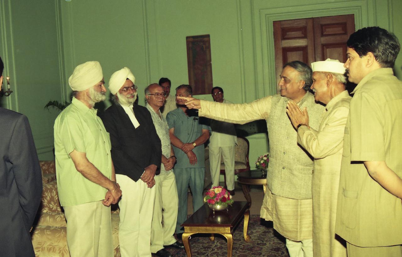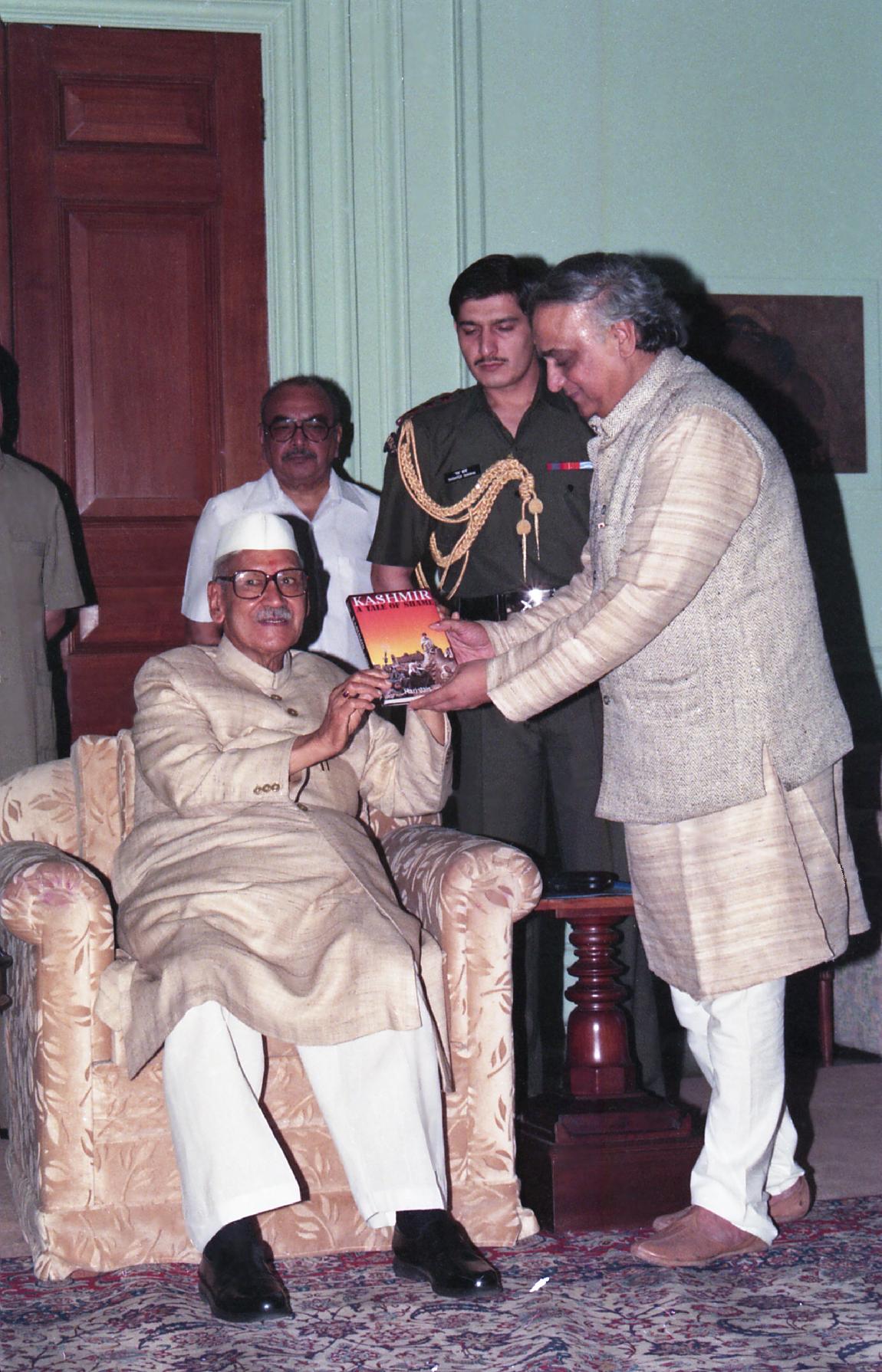| Caption: | The President of India, Dr. Shankar Dayal Sharma receiving a copy of the book "Kashmir-A Tale of Shame" from Shri Hari Jaisingh, Editor, The Tribune at Rashtrapati Bhavan in New Delhi on April 24, 1996. |