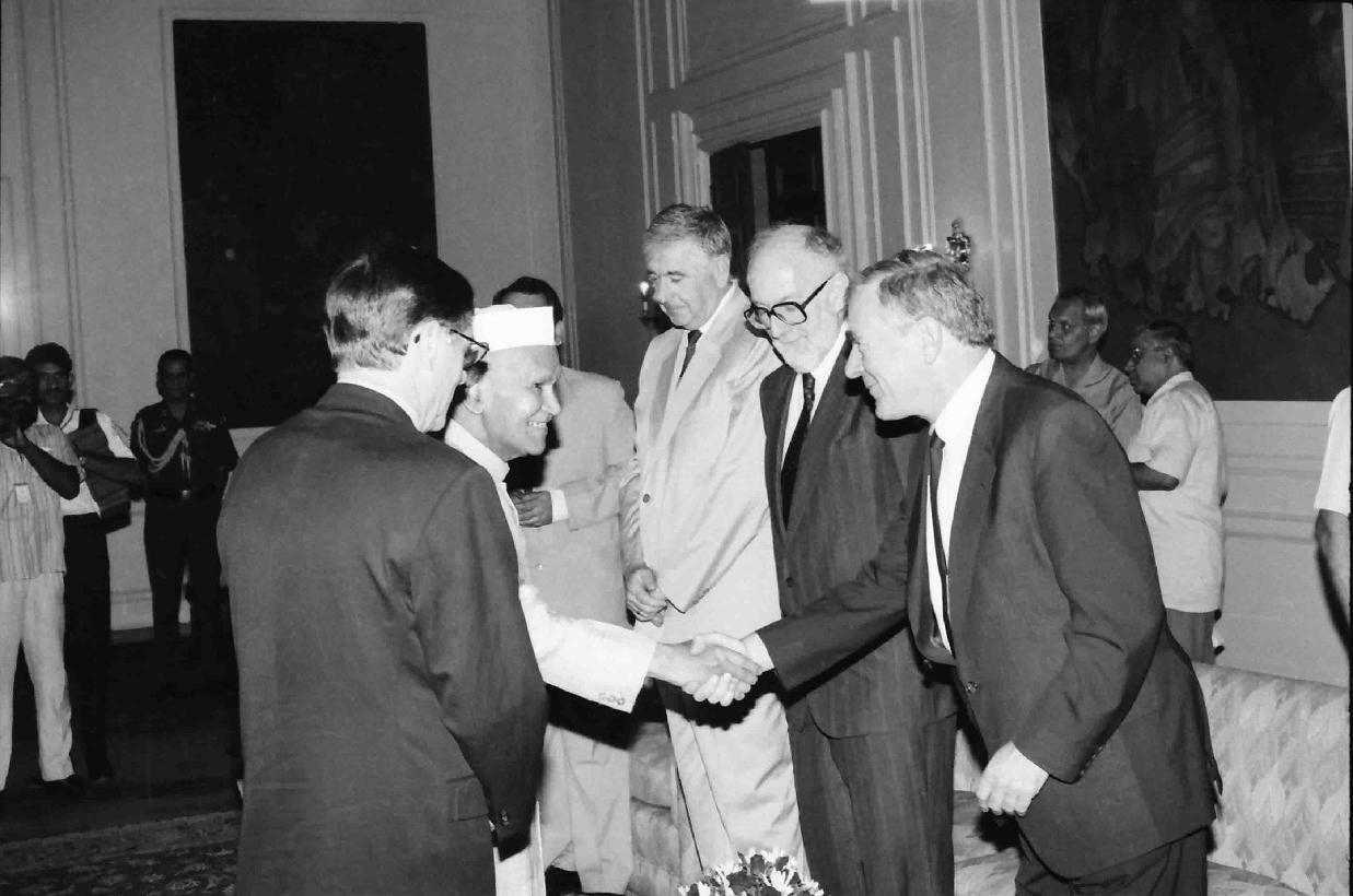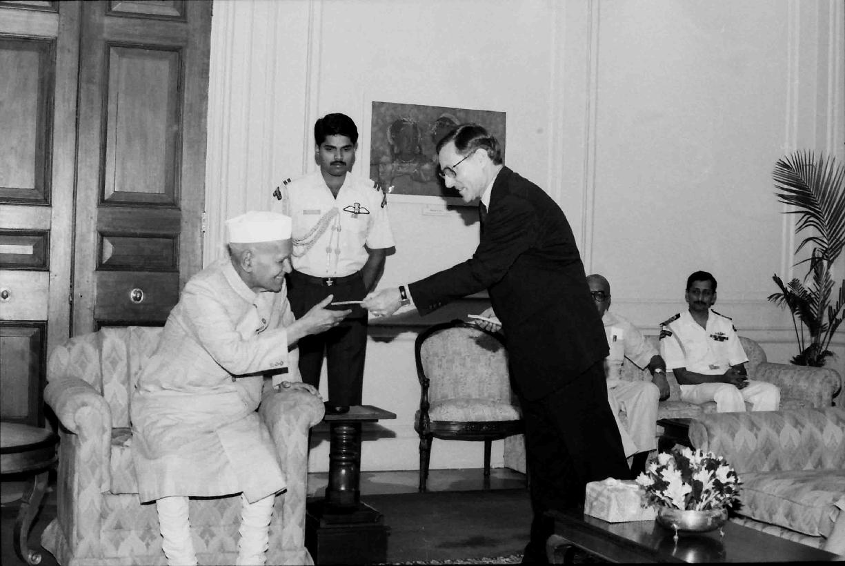 | Caption: | The President of India, Dr. Shankar Dayal Sharma receiving the first copy of the 1995 reprint of UN Charter in Hindi from Mr. Hans C. Von Sponeck, Resident Coordinator of the United Nations in India at Rashtrapati Bhavan in New Delhi on June 23, 1995. |