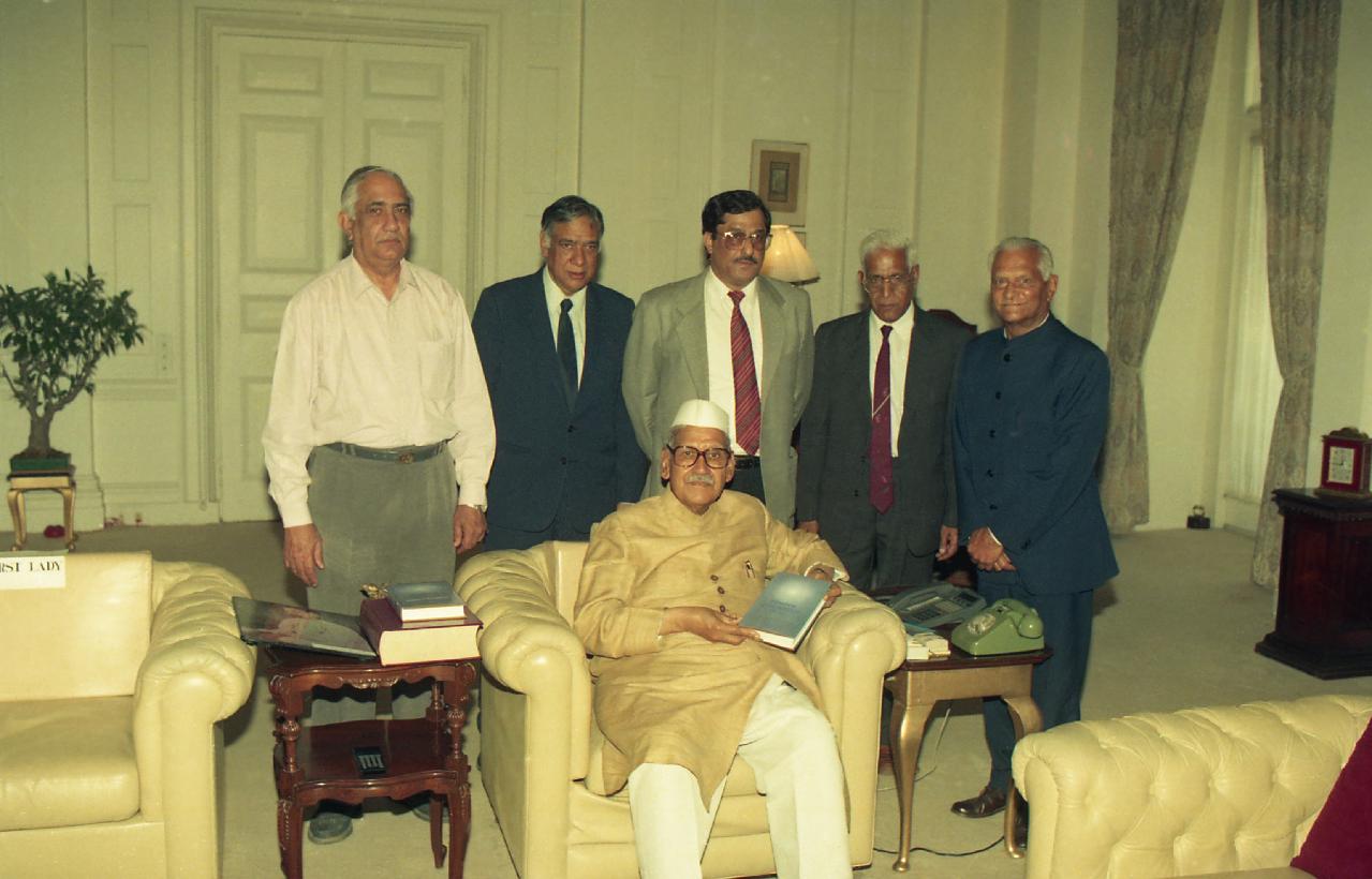 | Caption: | The President of India, Dr. Shankar Dayal Sharma receiving a copy of the book "Power Unlimited" from Shri D.N. Saraf with others at Rashtrapati Bhavan in New Delhi on March 07, 1996. |