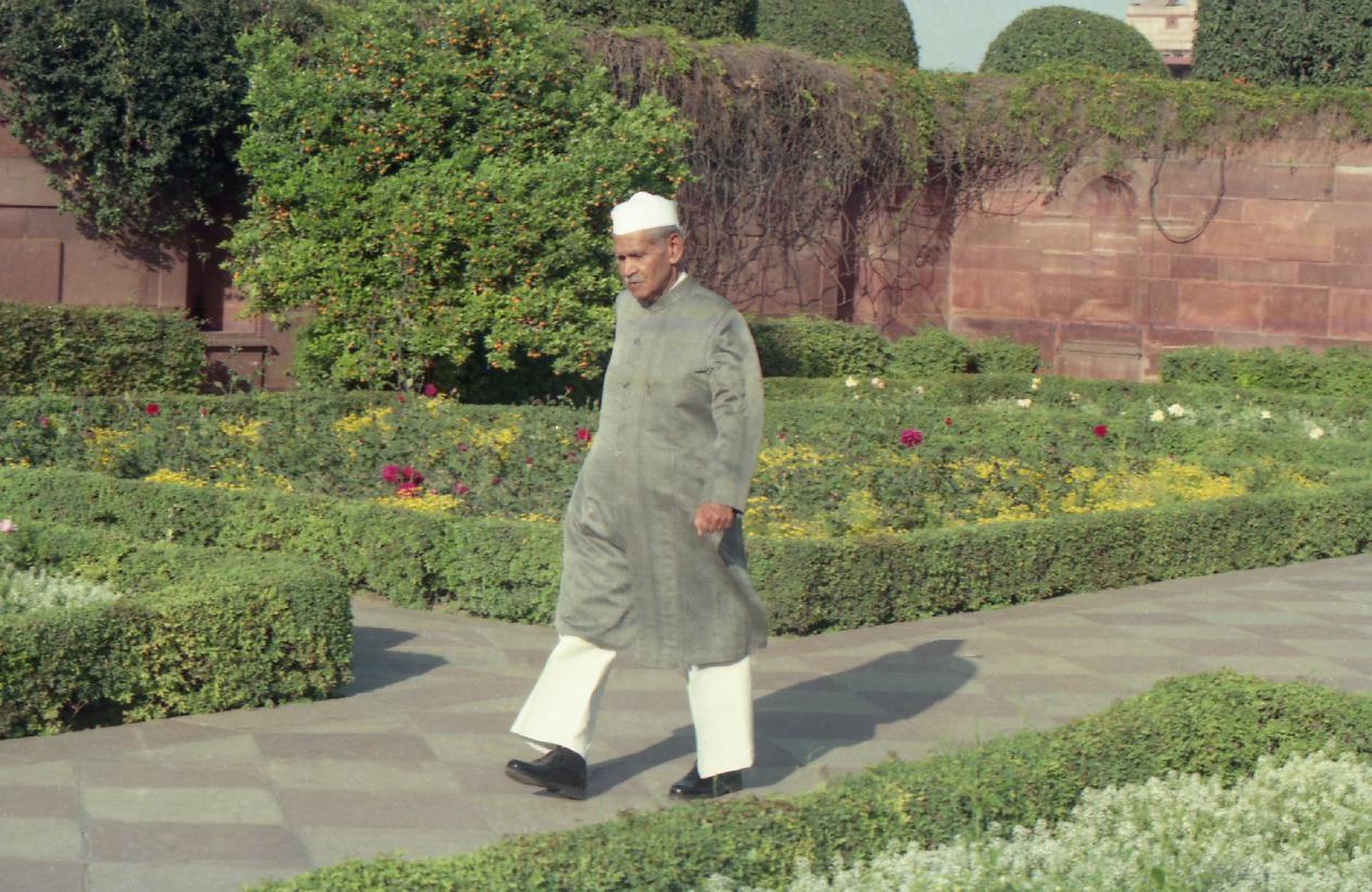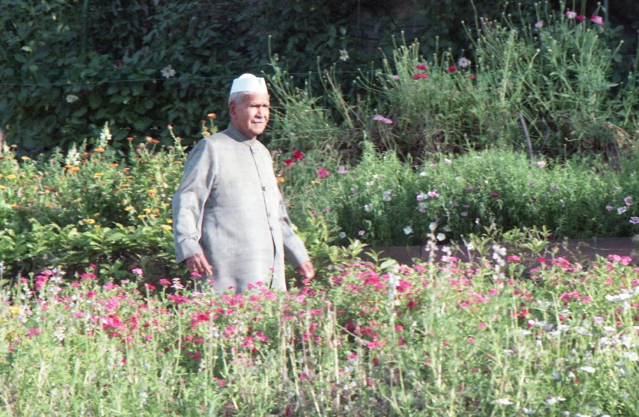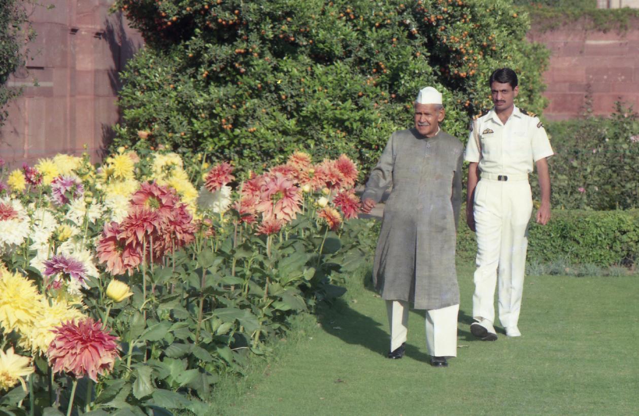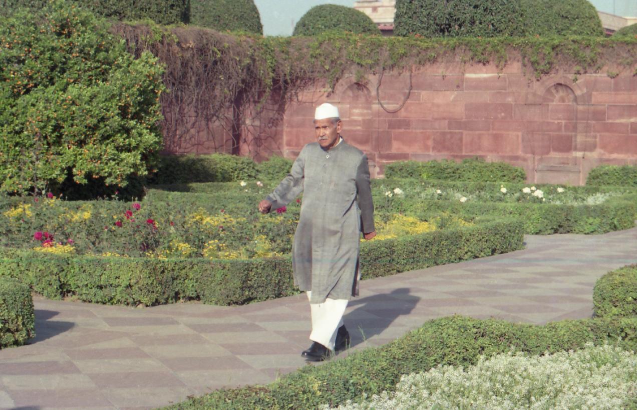 | Caption: | The President of India, Dr. Shankar Dayal Sharma walking at Mughal Garden, Rashtrapati Bhavan on March 14, 1996. |