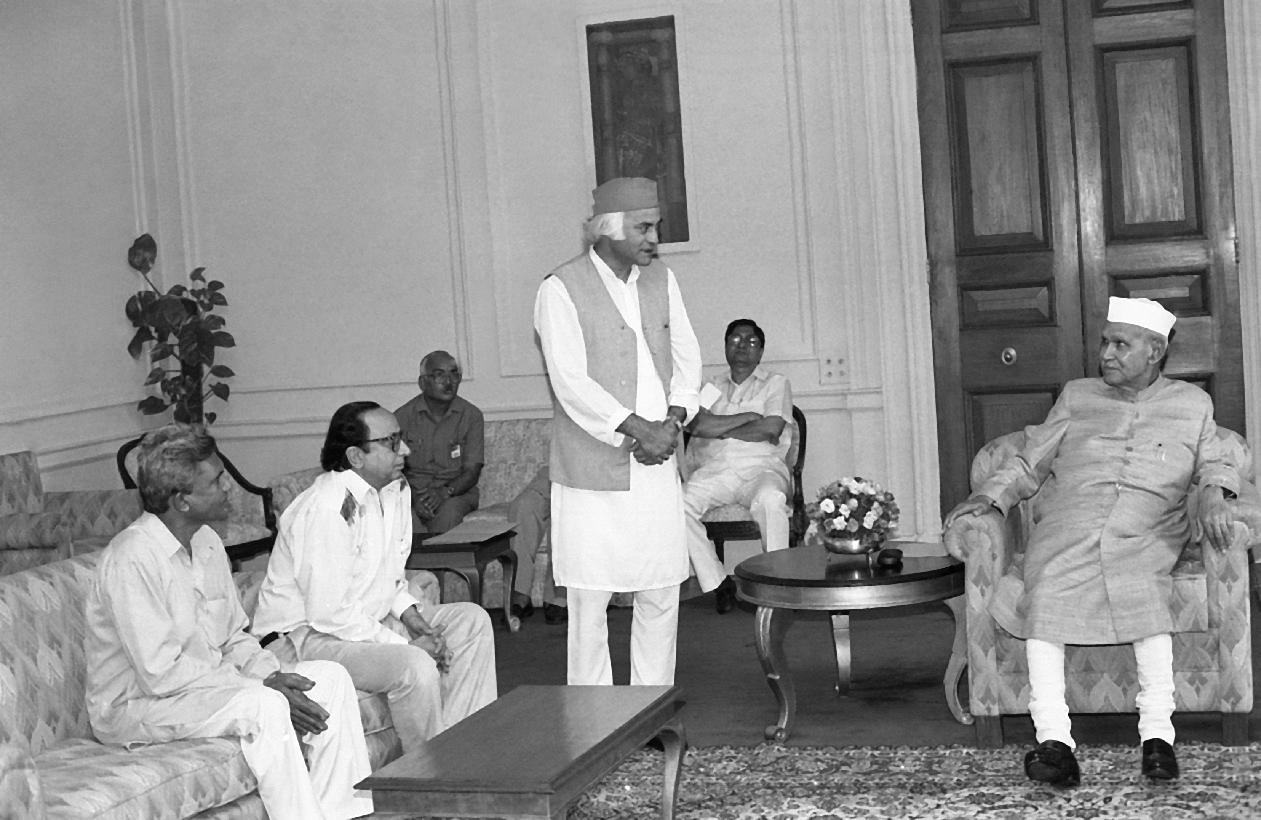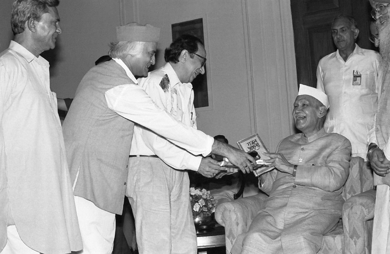 | Caption: | The President of India, Dr. Shankar Dayal Sharma releasing the Hindi Gazal book "Gazal Aarana" at Rashtrapati Bhavan in New Delhi on July 22, 1994. |