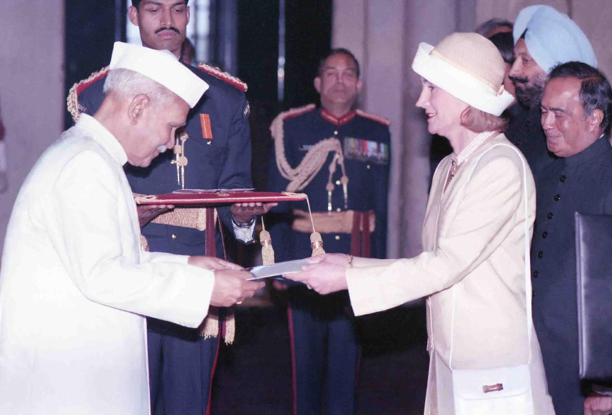 | Caption: | The Ambassador-Designate of Argentina to India, H.E. Miss Elda Sampietro presenting her credentials to the President of India, Dr. Shankar Dayal Sharma at Rashtrapati Bhavan in New Delhi on March 02, 1994. |