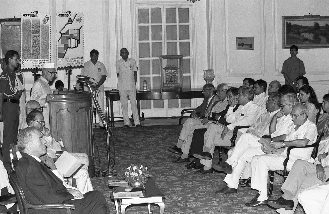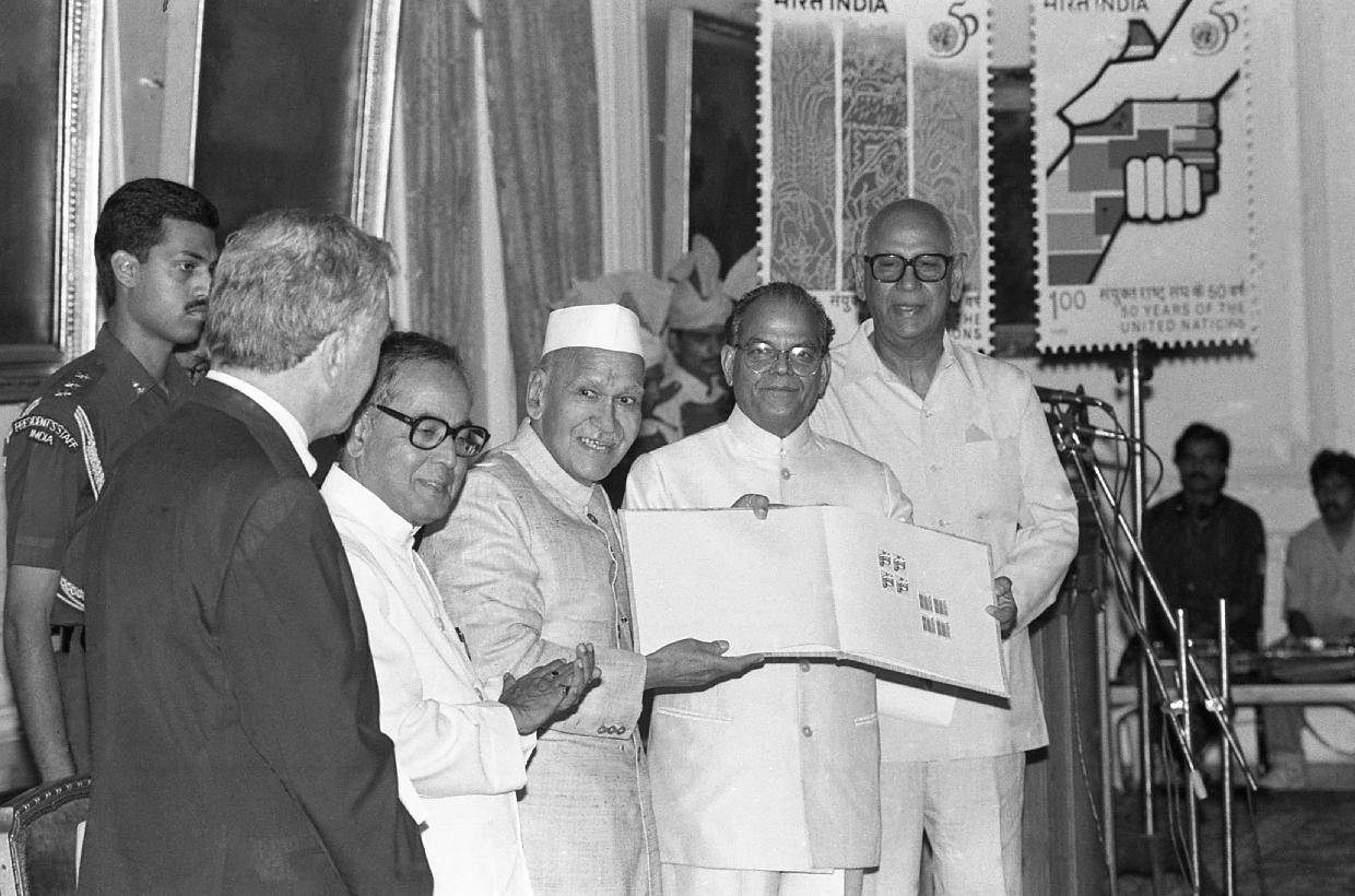 | Caption: | The President of India, Dr. Shankar Dayal Sharma releasing the Commemorative stamp/first day cover to mark the 50th anniversary year of the founding of the United Nations at Rashtrapati Bhavan in New Delhi on June 26, 1995. |