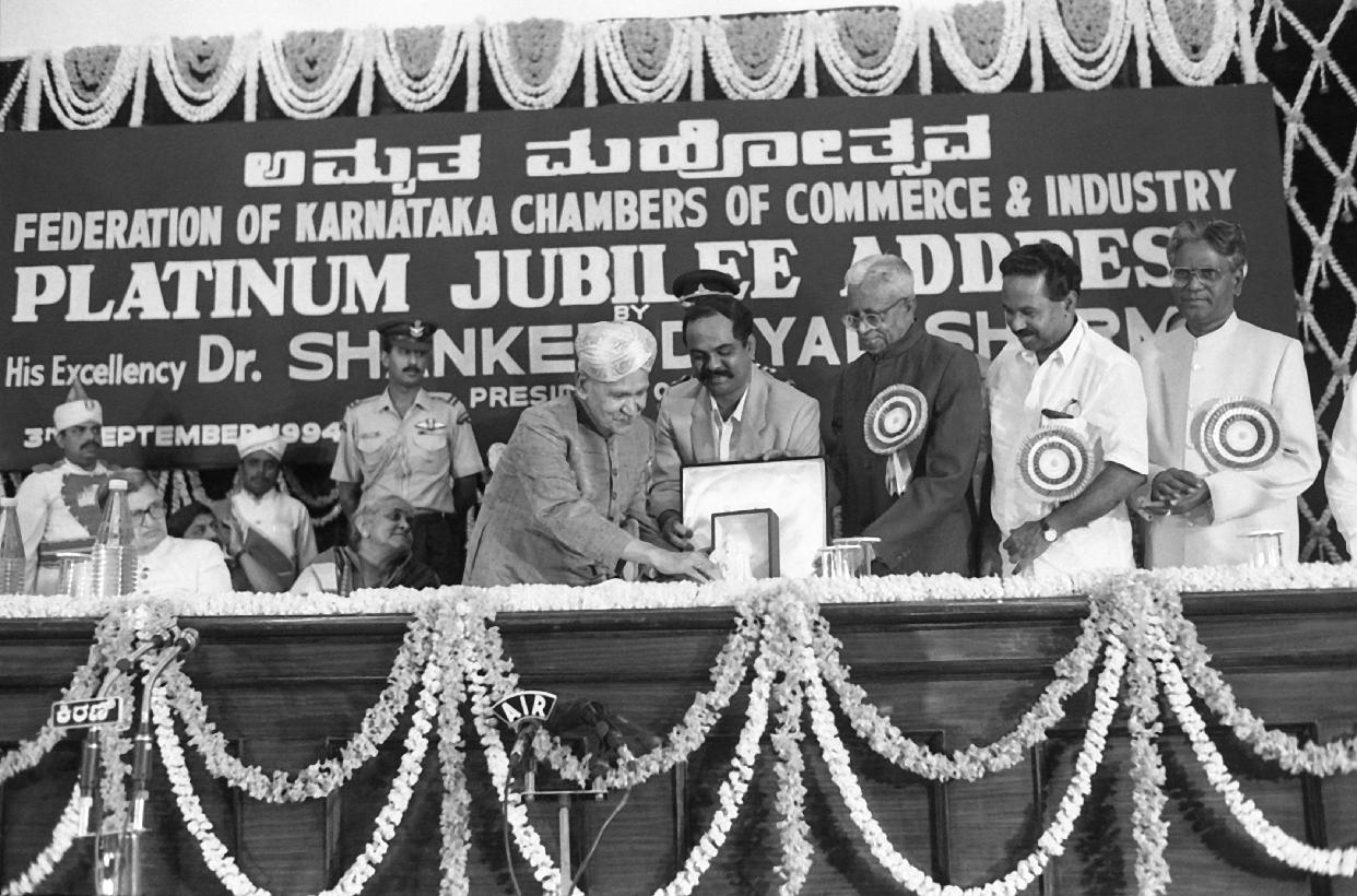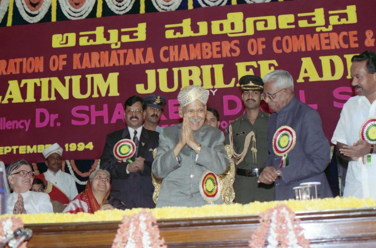 | Caption: | The President of India, Dr. Shankar Dayal Sharma during the concluding function of the Platinum Jubilee Celebrations of the Federation of Karnataka Chamber of Commerce and Industry, at Vidhana Soudha, Bangalore, in Karnataka on September 03, 1994. |