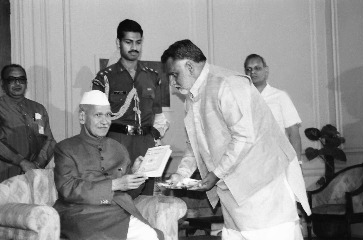 | Caption: | The President of India, Dr. Shankar Dayal Sharma receiving a copy of the book "Hindi Patrakarita Aur Rashtriya Andolan" of Dr. Padmakar Pandey at Rashtrapati Bhavan in New Delhi on March 17, 1994. |