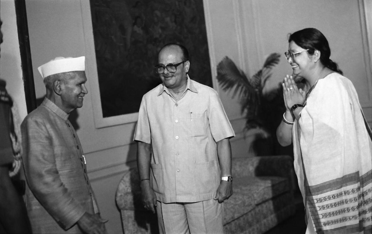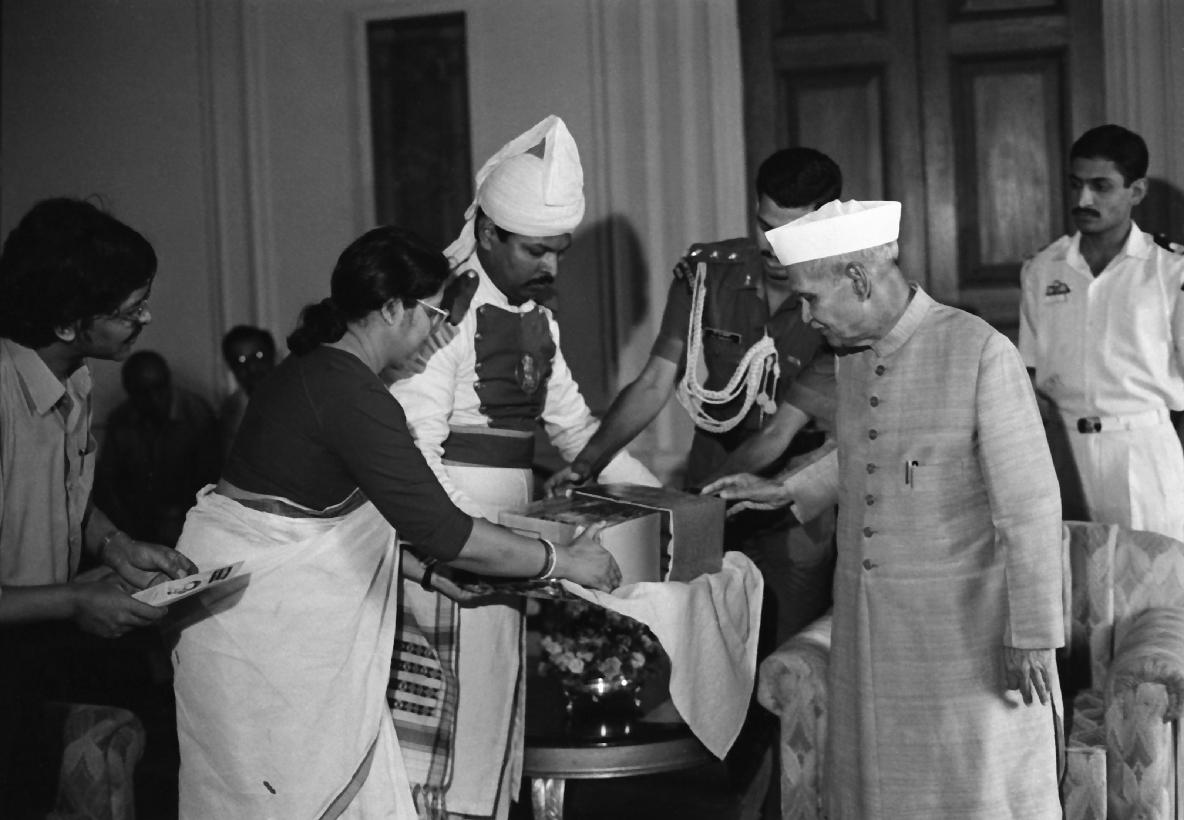 | Caption: | The President of India, Dr. Shankar Dayal Sharma receiving a set of the books "Rahul Granthavali" from Smt. Jaya S. Parhawk at Rashtrapati Bhavan in New Delhi on August 11, 1994. |
