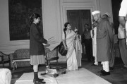 | Caption: | The President of India, Dr. Shankar Dayal Sharma meeting with Miss Julie Mehrotra with Shri Jagdish Gandhi and Miss Sadhana Chooramani of City Montessori School, Lucknow at Rashtrapati Bhavan in New Delhi on March 17, 1994. |