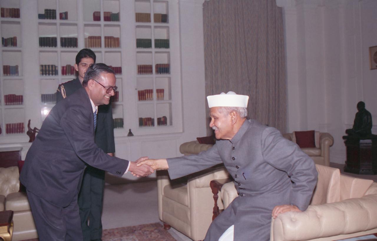 | Caption: | The President of India, Dr. Shankar Dayal Sharma meeting with Shri S.K. Singh, Addl. CP, R.P. Bhavan at Rashtrapati Bhavan in New Delhi on November 29, 1994. |