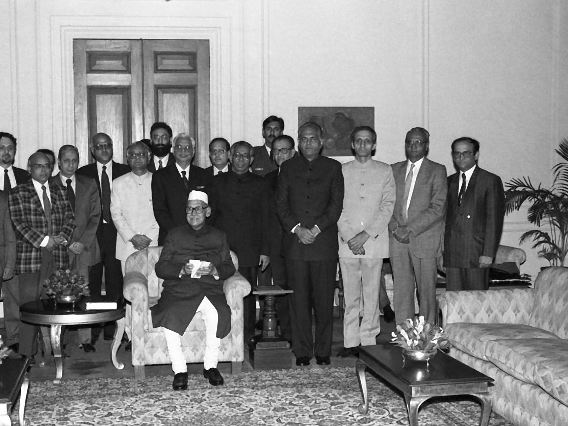 | Caption: | The President of India, Dr. Shankar Dayal Sharma receiving the Finance Commission Report from Shri K.C. Pant, Chairman and Members of the Finance Commission at Rashtrapati Bhavan in New Delhi on November 26, 1994. |