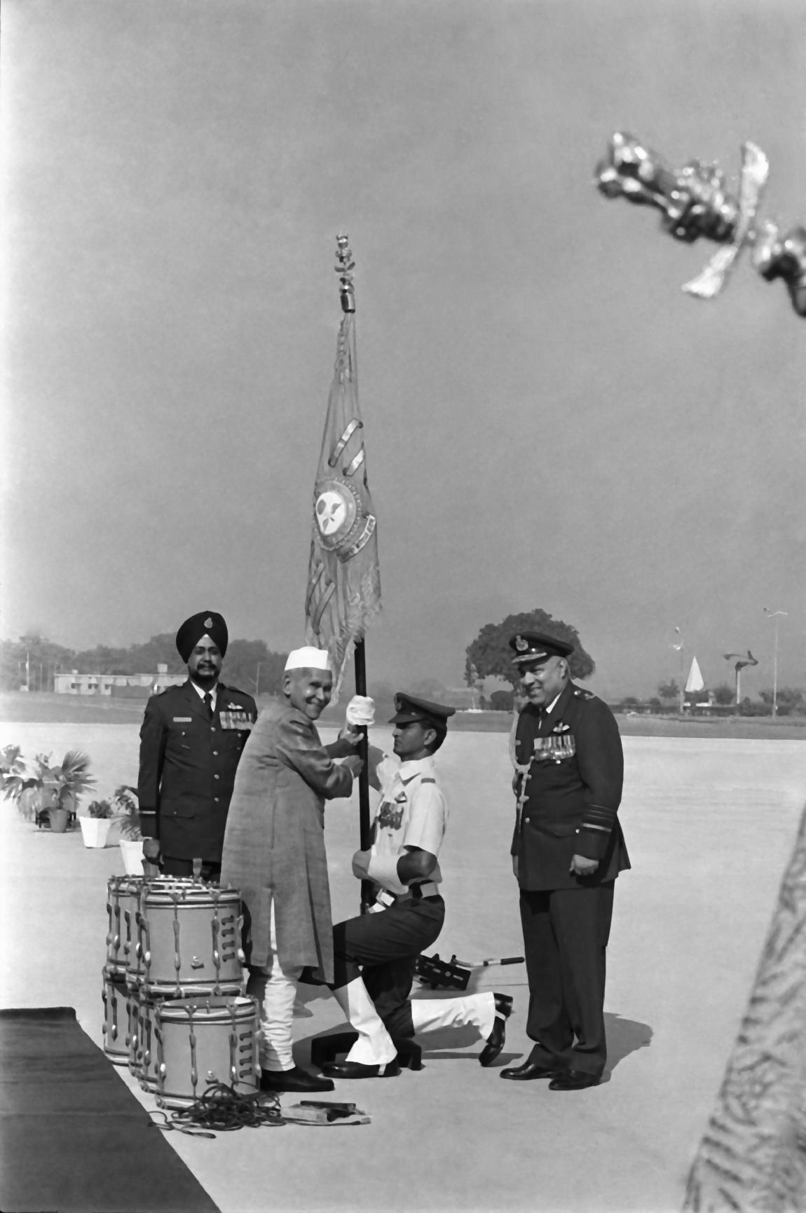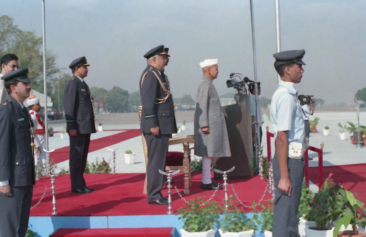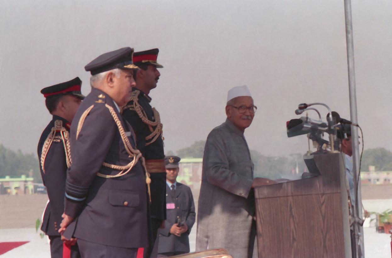 | Caption: | The President of India, Dr. Shankar Dayal Sharma presenting Standards to PTS and 14 Sqn and reviewing the Parade, at a function, in Ambala, Haryana on November 11, 1994. |