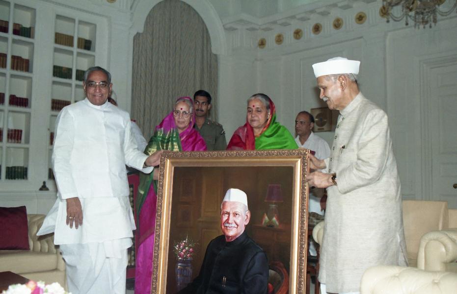 | Caption: | The President of India, Dr. Shankar Dayal Sharma receiving paintings from Governor of Uttar Pradesh, Shri Motilal Vora, at Rashtrapati Bhavan in New Delhi on April 27, 1994. |