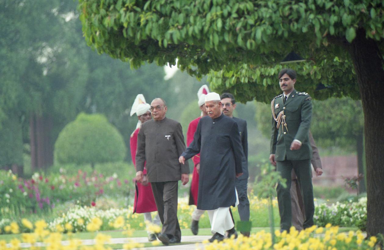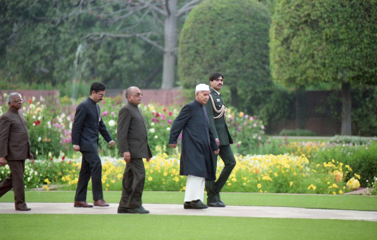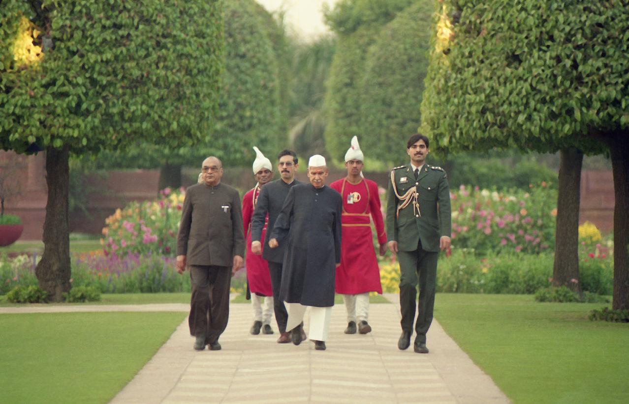 | Caption: | The President of India, Dr. Shankar Dayal Sharma walking at Mughal Gardens, Rashtrapati Bhavan in New Delhi on February 25, 1995. |