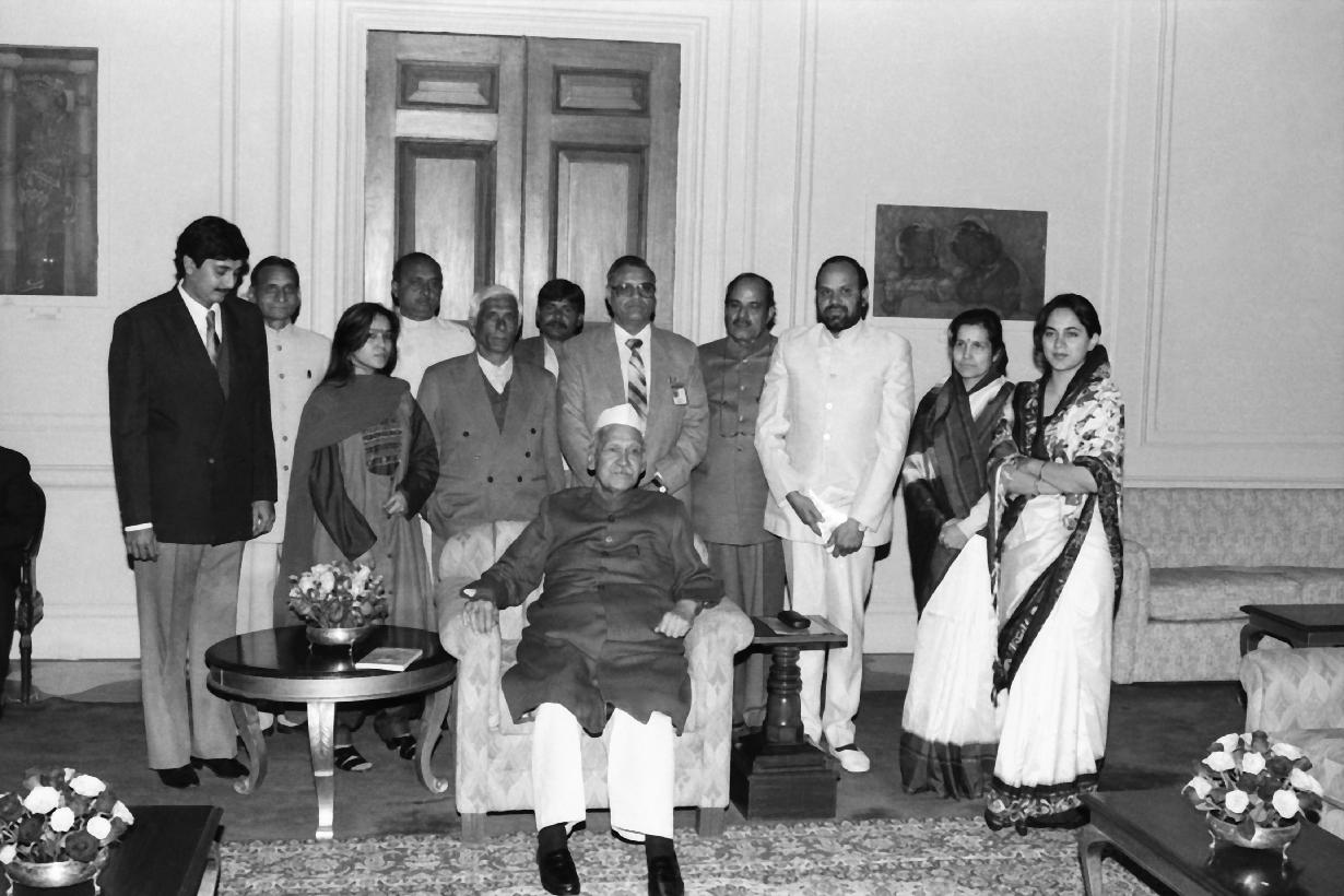 | Caption: | The President of India, Dr. Shankar Dayal Sharma receiving a copy of the book "Sanskrit Sahitya Mein Paryavaran Evam Kalidas Ki Vanaspatiyan" from Pt. Ramesh Kumar Sharma with others at Rashtrapati Bhavan in New Delhi on February 04, 1995. |