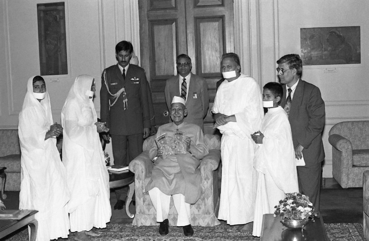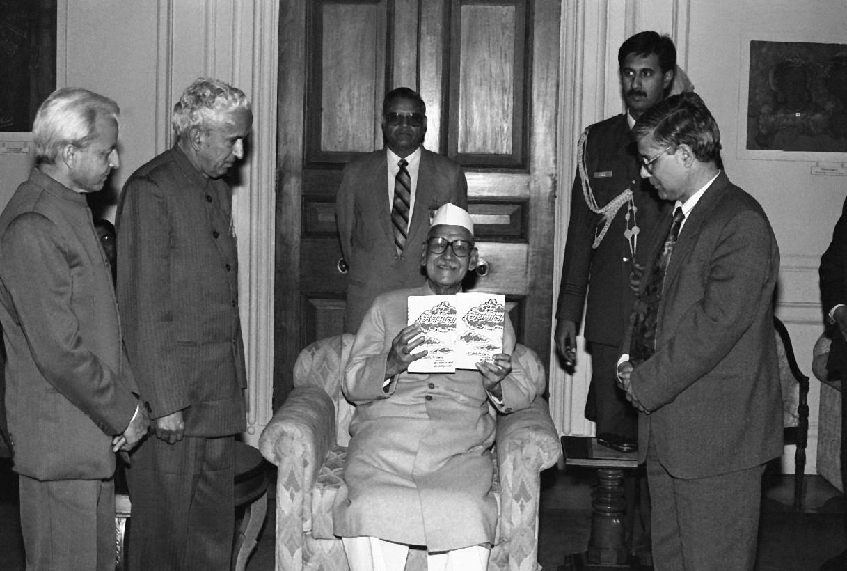 | Caption: | The President of India, Dr. Shankar Dayal Sharma receiving a copy of the book "Meghmala" of Himalaya Sanskriti Evam Rahasya Vigyan Sansthan, Shimla at Rashtrapati Bhavan in New Delhi on March 10, 1995. |