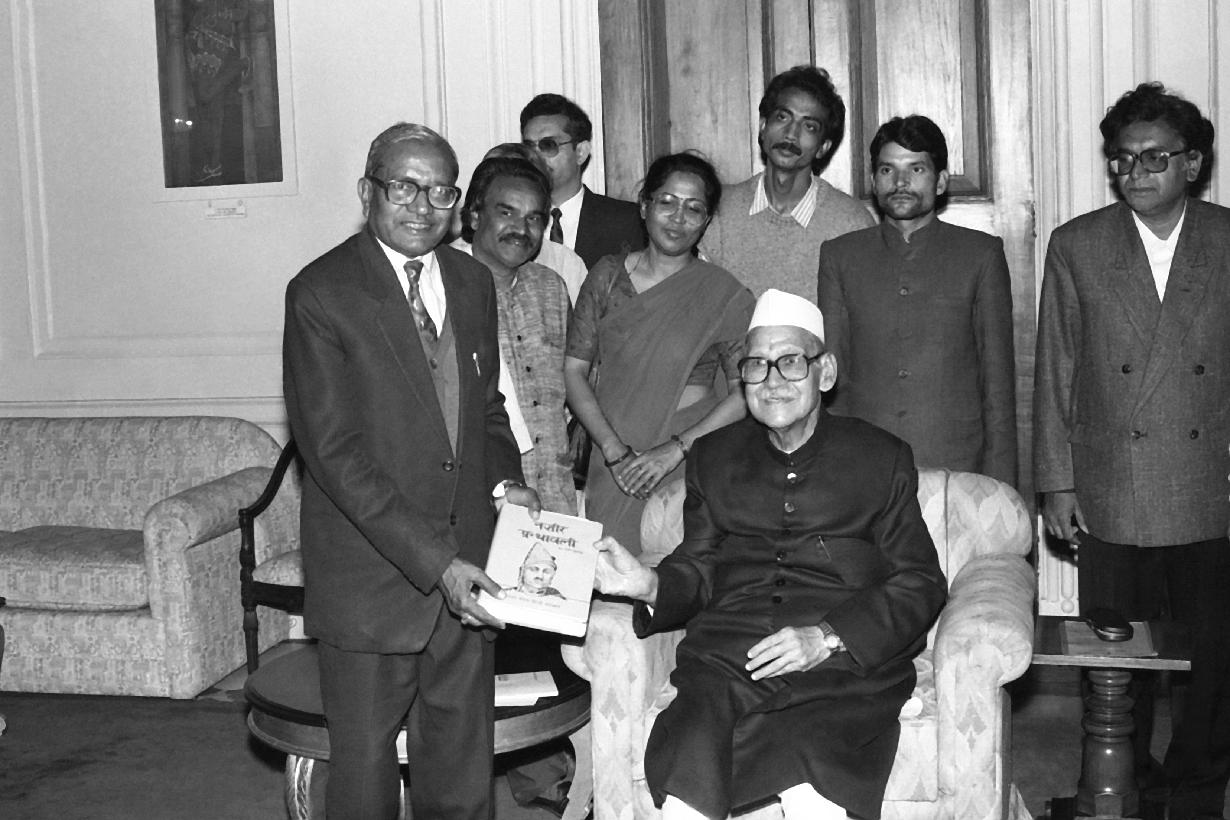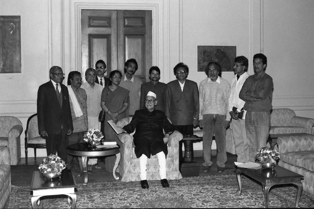 | Caption: | A delegation of the Indian People's Theatre Association calling on the President of India, Dr. Shankar Dayal Sharma at Rashtrapati Bhavan in New Delhi on March 11, 1995. |