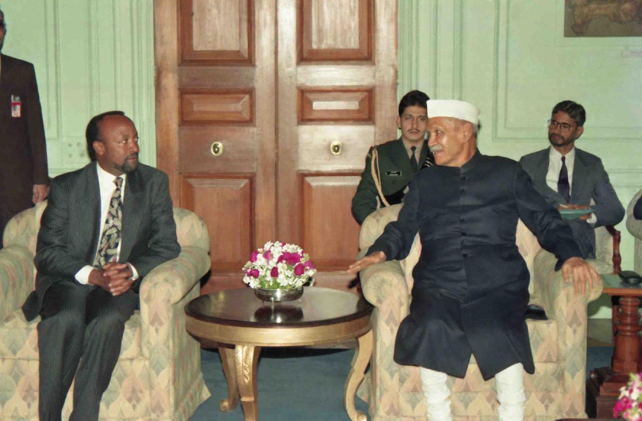 | Caption: | The President of India, Dr. Shankar Dayal Sharma meeting with H.E. Mr. Nangolo Mbumba, Minister for Agriculture, Water & Rural Development of Namibia at Rashtrapati Bhavan in New Delhi on March 11, 1995. |