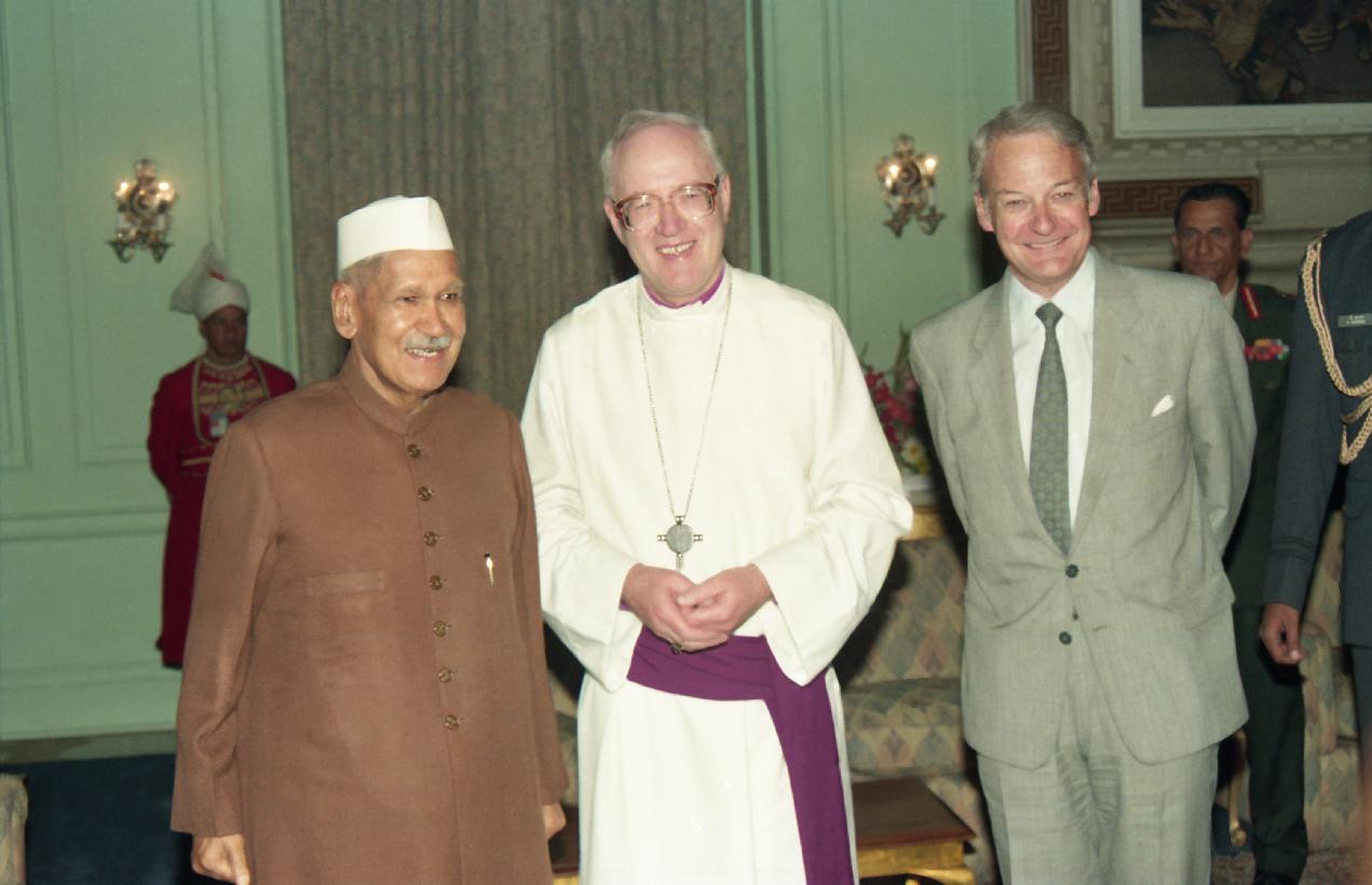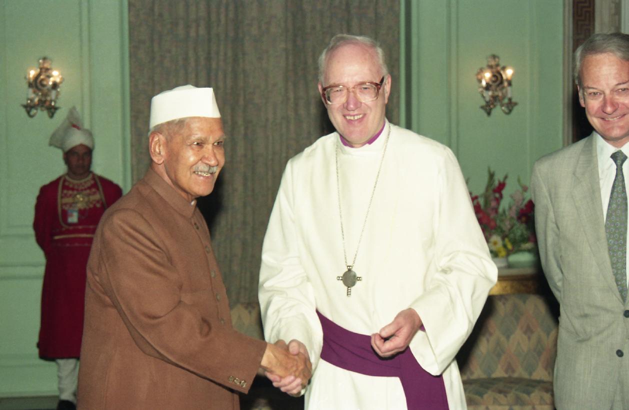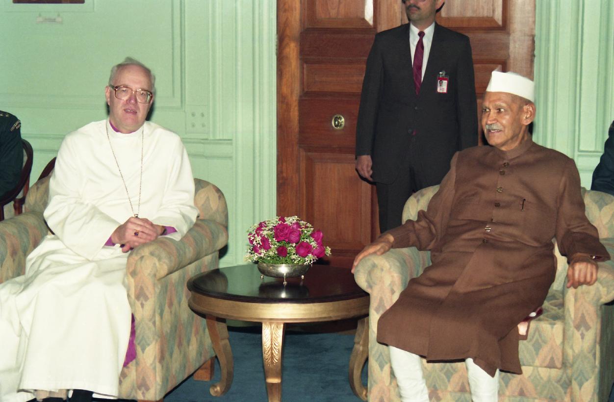 | Caption: | The President of India, Dr. Shankar Dayal Sharma meeting with Most Rev. and Rt. Hon. Dr. George Leonard Carey, the Archbishop of Canterbury with others at Rashtrapati Bhavan in New Delhi on February 11, 1995. |