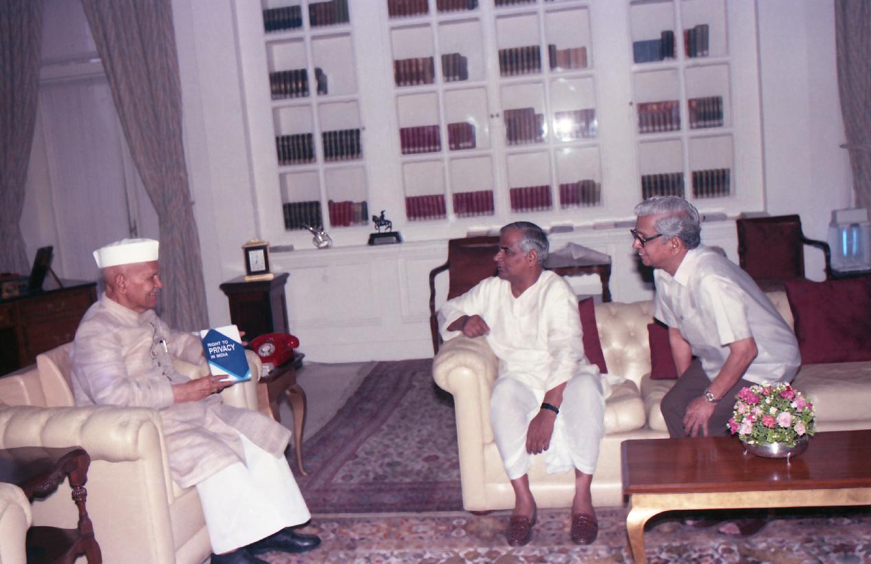 | Caption: | The President of India, Dr. Shankar Dayal Sharma receiving a copy of the book "Right to Privacy in India" from Dr. Govind Mishra at Rashtrapati Bhavan in New Delhi on June 13, 1994. |