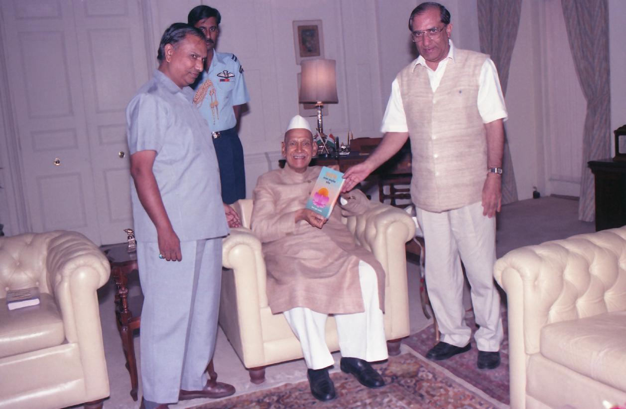 | Caption: | The President of India, Dr. Shankar Dayal Sharma receiving a copy of the book from Shri V.K. Malhotra at Rashtrapati Bhavan in New Delhi on June 14, 1994. |